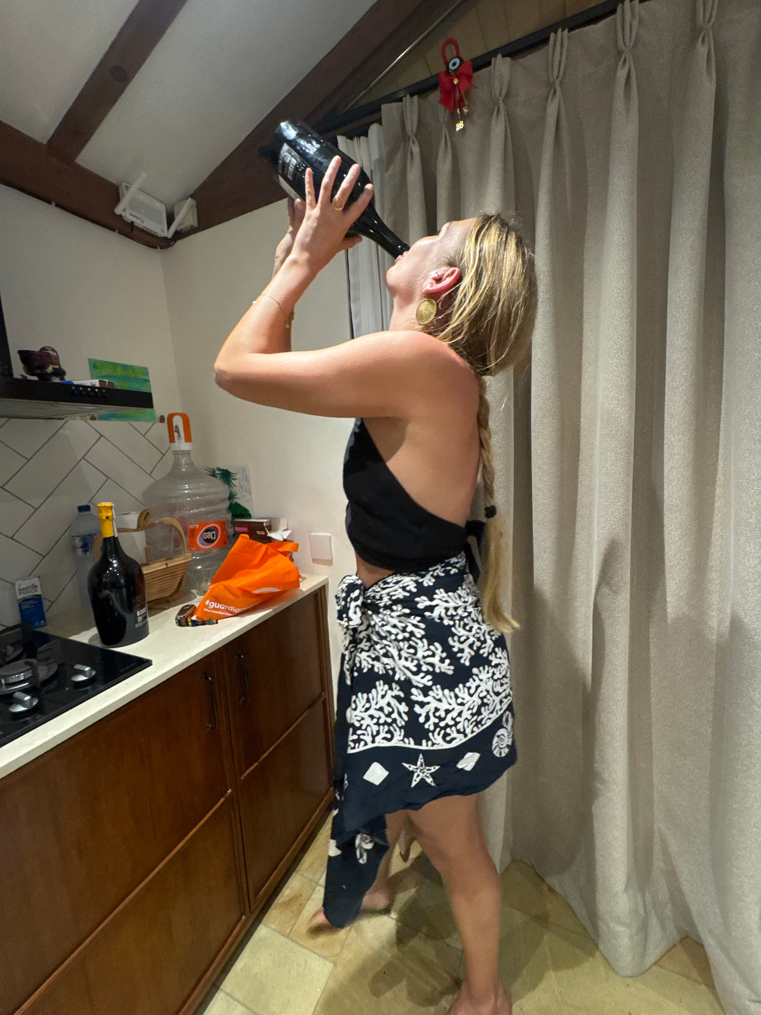 A woman with blonde hair in a braid is holding a wine bottle up to her mouth, seemingly about to drink from it. She is wearing a black halter top and a blue and white patterned skirt. She is standing…read more