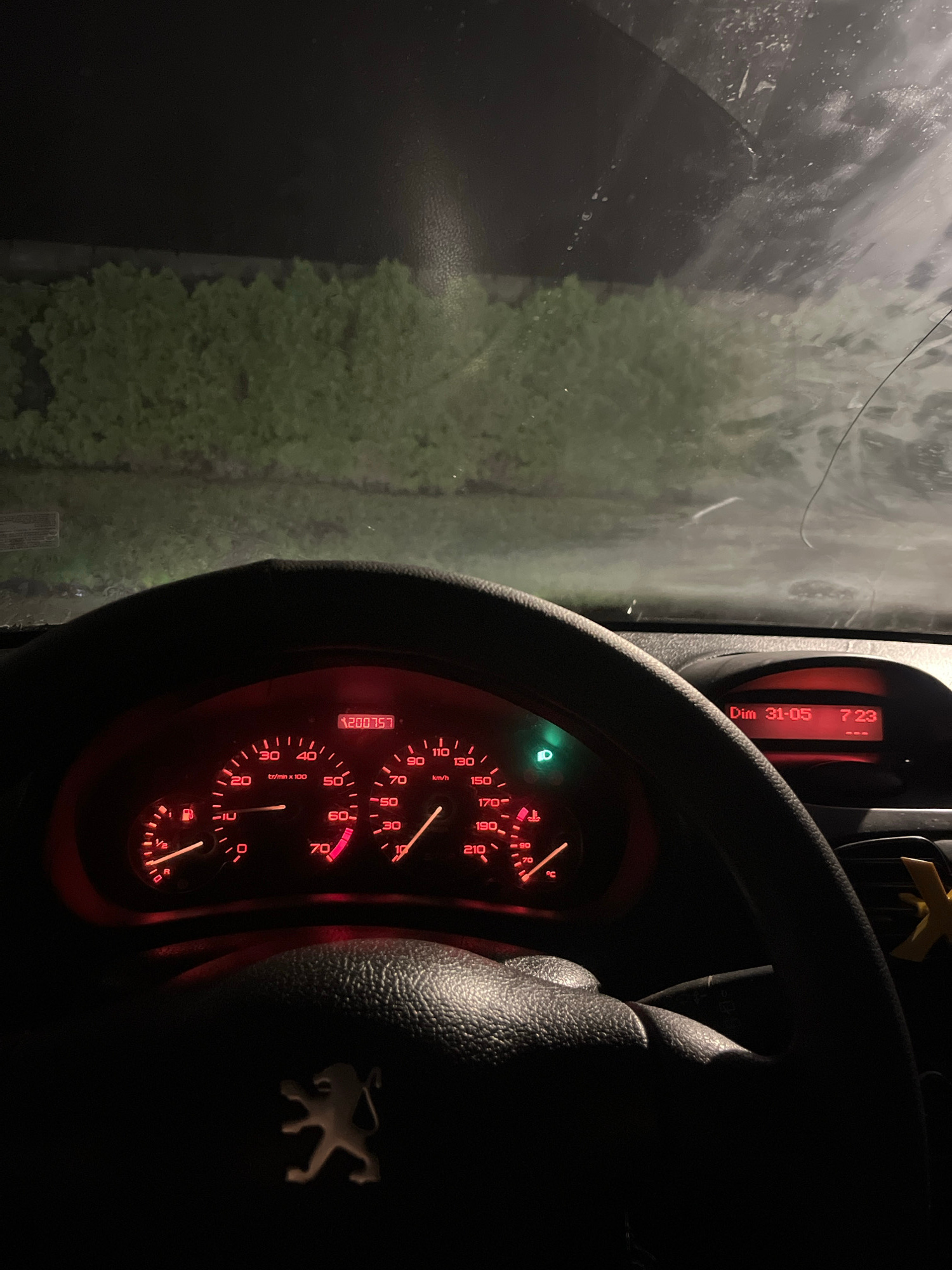 The image is an interior shot of a car, with the focus primarily on the dashboard and steering wheel. The speedometer and other instrument panel lights are illuminated in red. The odometer reads "2007…read more