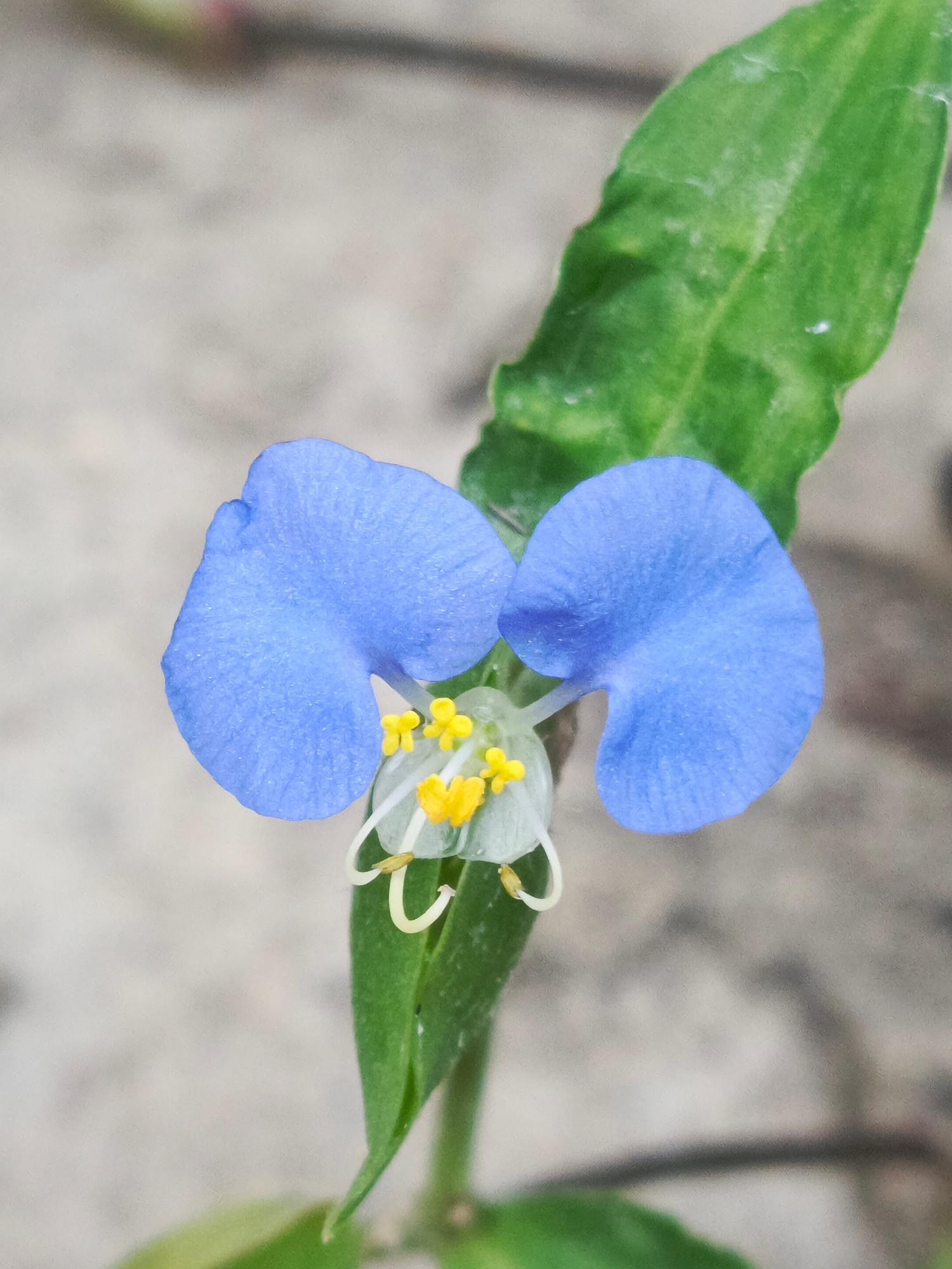 The image depicts a close-up of a blue Commelina erecta flower, also known as the dayflower, situated in what appears to be an outdoor environment in the city of Tinaco, Venezuela. The flower has two…read more