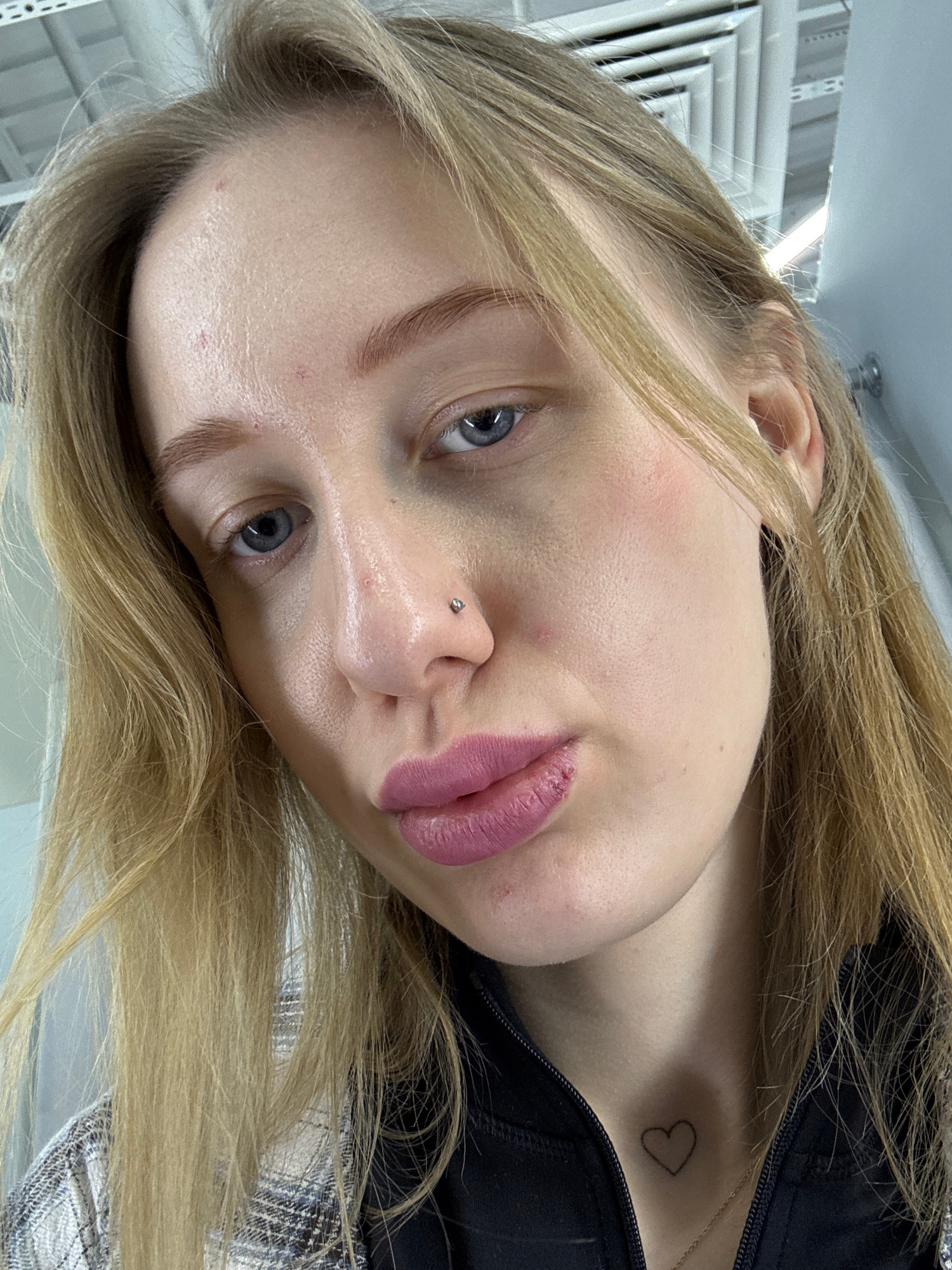 A young, light-skinned woman with blonde hair is shown close-up in a slightly angled headshot. She has a nose piercing, light eyebrows, and grey eyes. Her lips are pink. A small heart tattoo is visibl…read more
