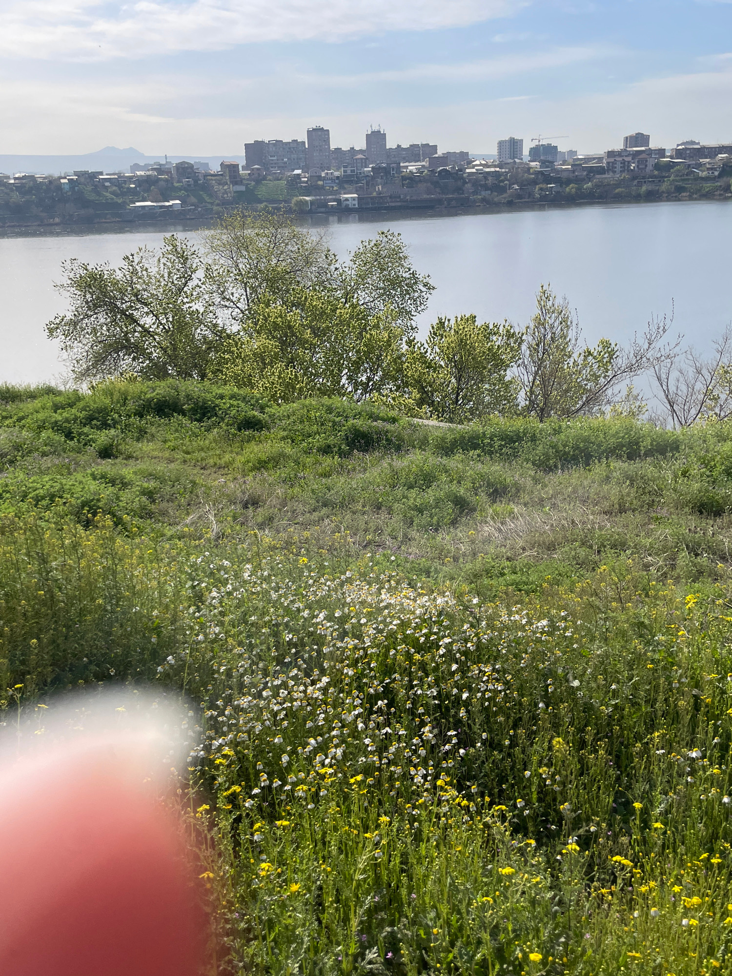 This media file captures a vibrant outdoor scene, likely in Yerevan, Armenia, showcasing a juxtaposition of nature and urban development. The dominant foreground features a dense field of wildflowersβ¦read more