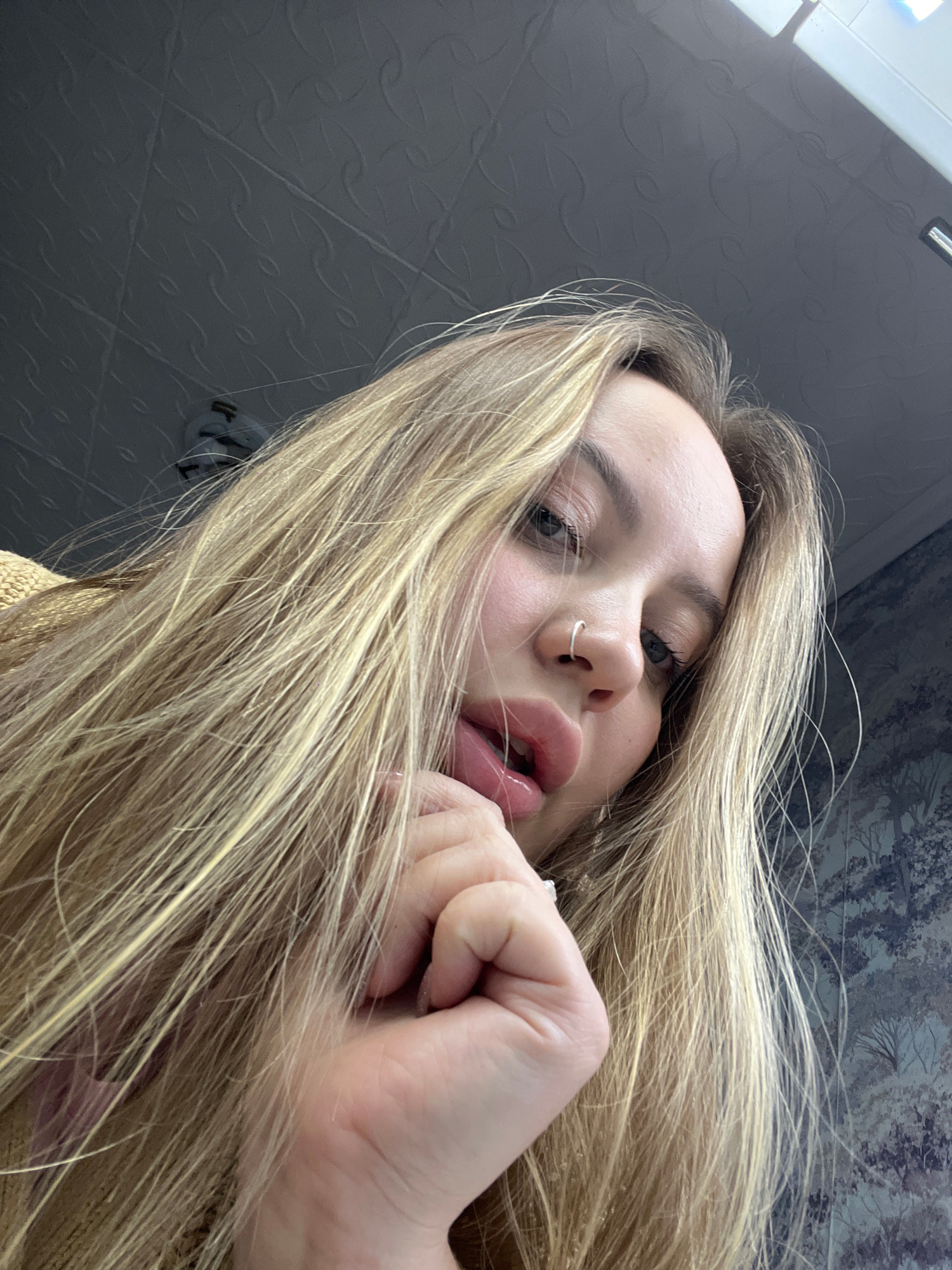 The image captures a close-up, low-angle perspective of a young woman with long, flowing blonde hair, looking directly into the camera. Her face fills a significant portion of the frame, emphasizing h…read more