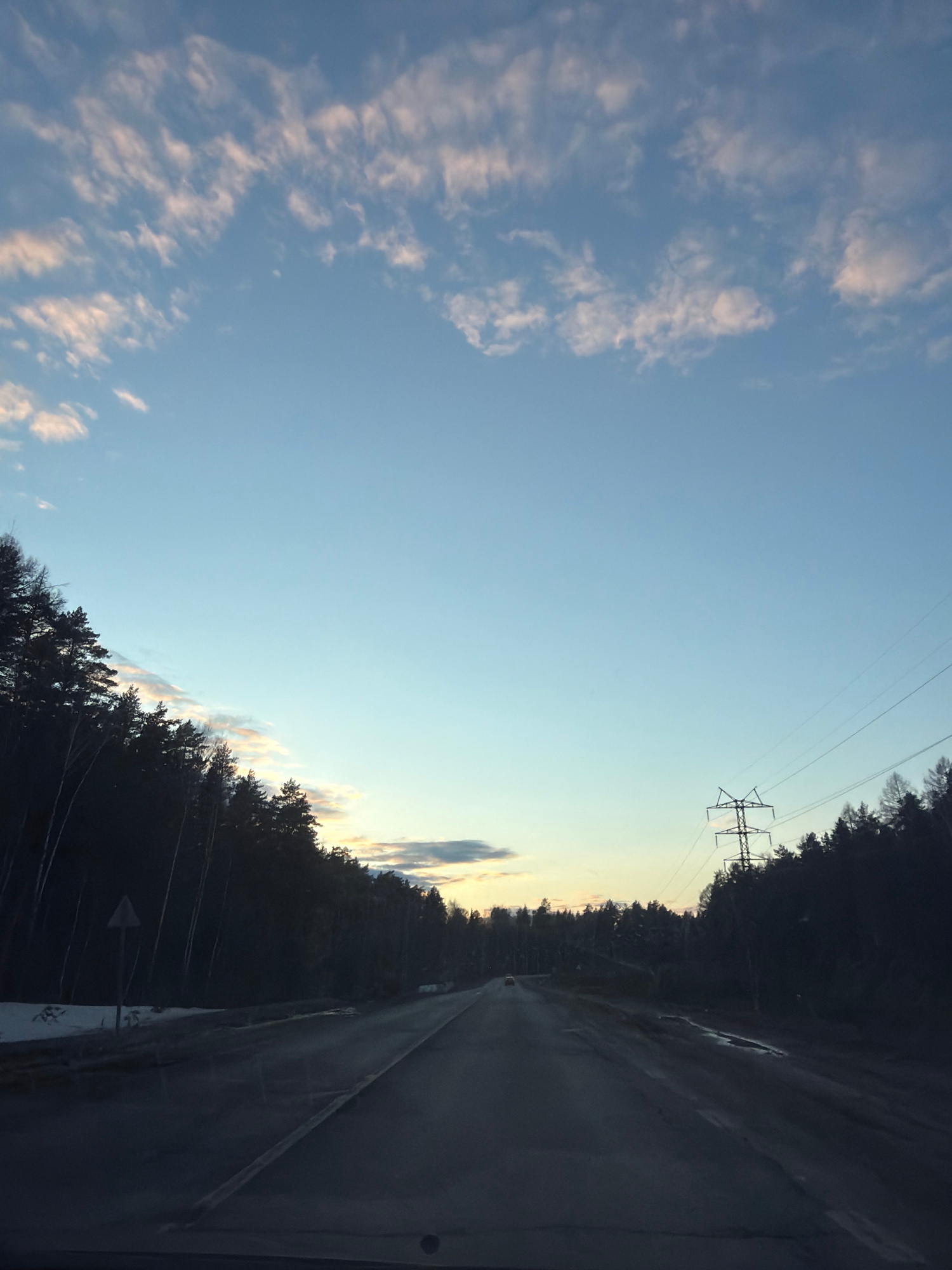 The image depicts a road stretching into the distance, flanked by a forest on one side and a cloudy sky on the other. An electrical transmission tower is visible near the center of the frame. The loca…read more