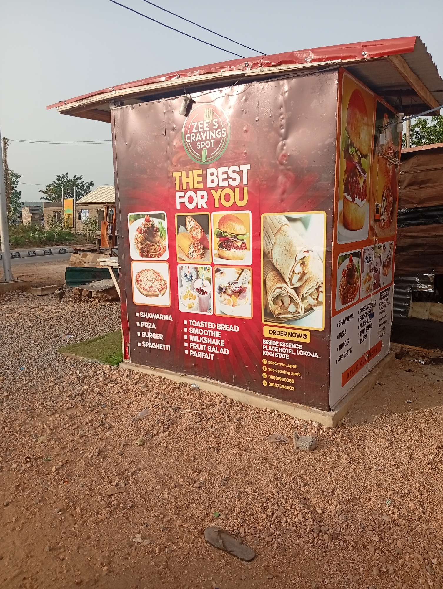 The image shows a food stand at the side of a road in what appears to be Adankolo, Nigeria. The stand, branded "Zee's Cravings Spot," is a small, enclosed structure with a red roof. The exterior is co…read more