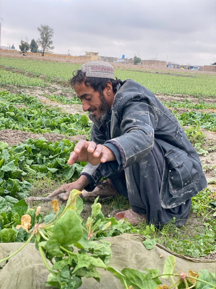 An older man in traditional clothing, including a decorative hat, crouches in a field of leafy green crops. He appears to be working or tending to the plants, with his hands extended toward them. The…read more