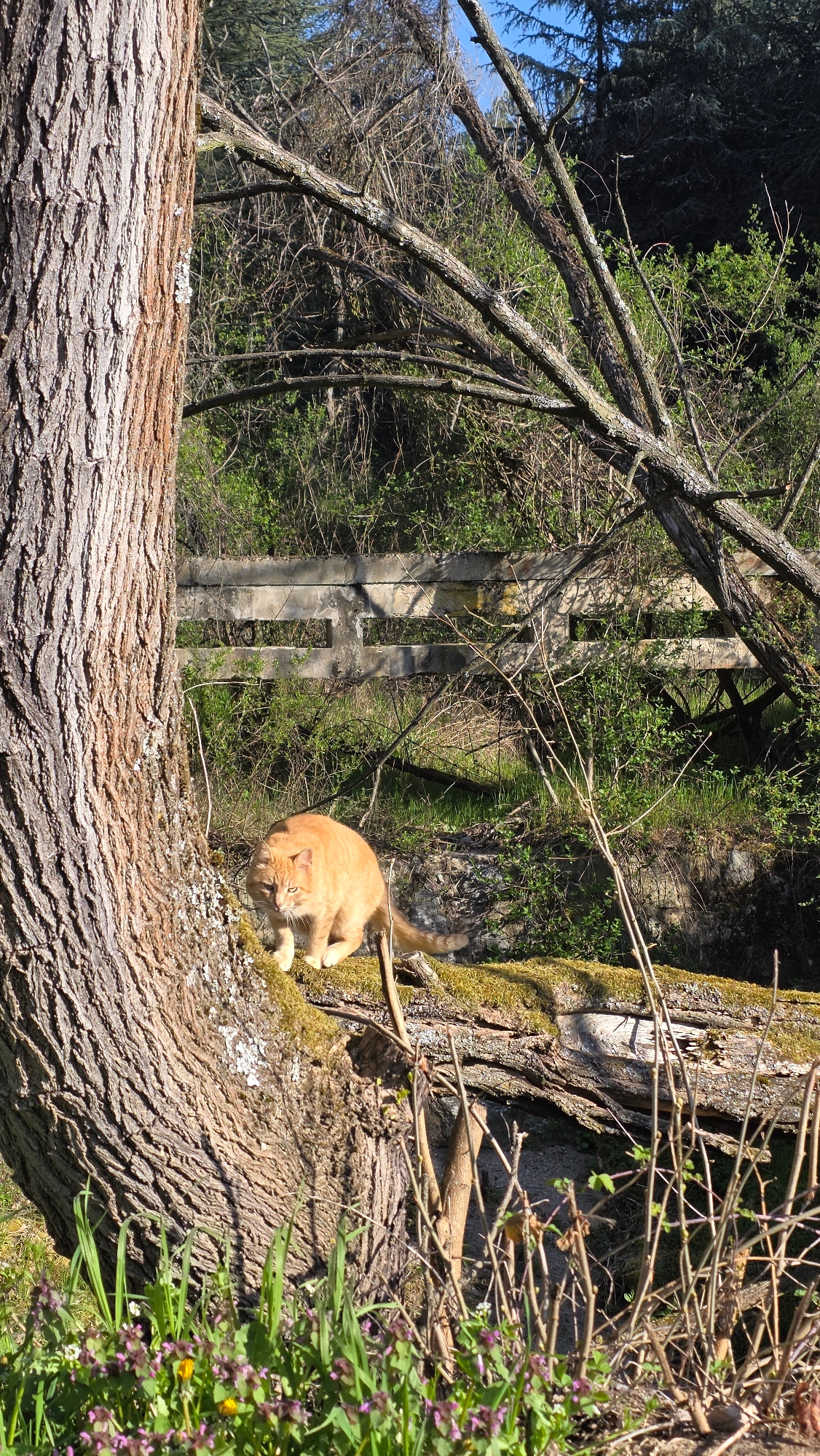 An orange cat is perched on a fallen tree trunk, facing forward and to the left. The tree trunk lies in a grassy area with purple and yellow flowers and various small branches. Behind the tree is a fo…read more