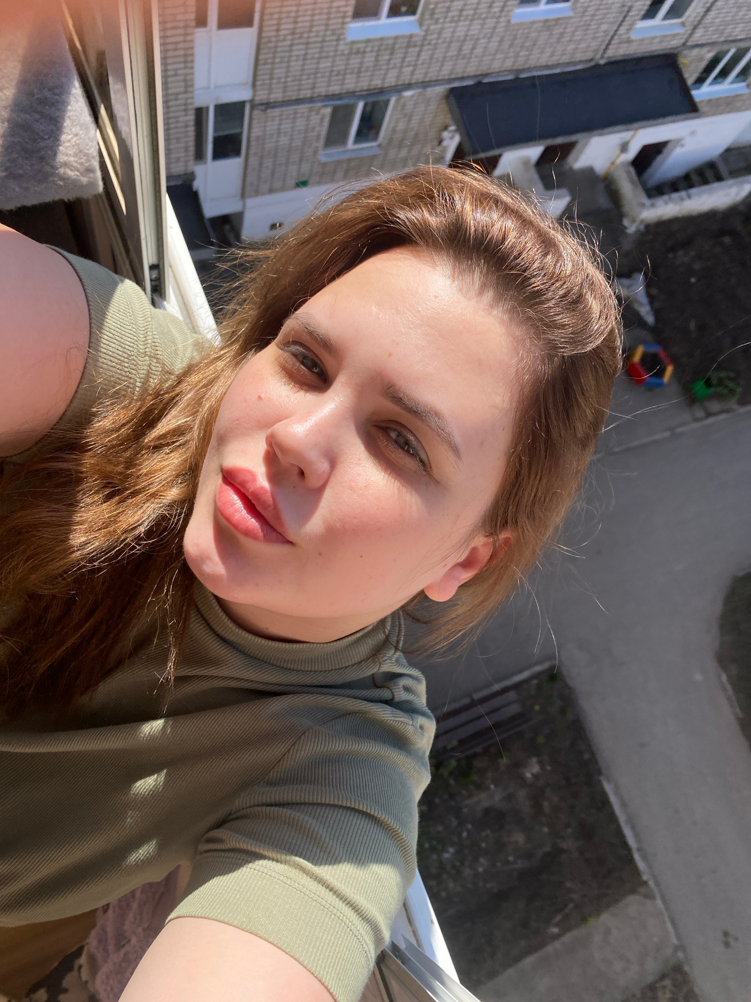 A young woman takes a selfie from a high vantage point, likely a window or balcony, overlooking a residential area in Chernushka, Russia. Her upper body is visible, angled slightly upwards towards the…read more