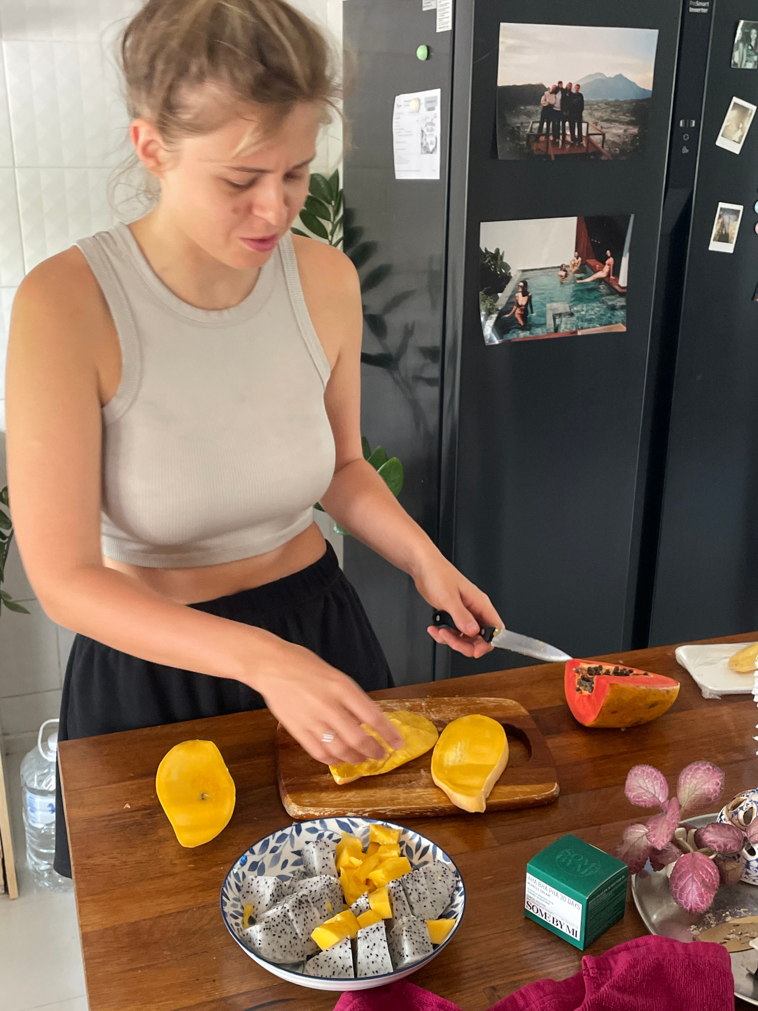 A woman in a white tank top and black shorts is preparing fruit on a wooden table next to a black refrigerator. She is using a knife to cut a mango on a wooden cutting board. Other fruits on the table…read more