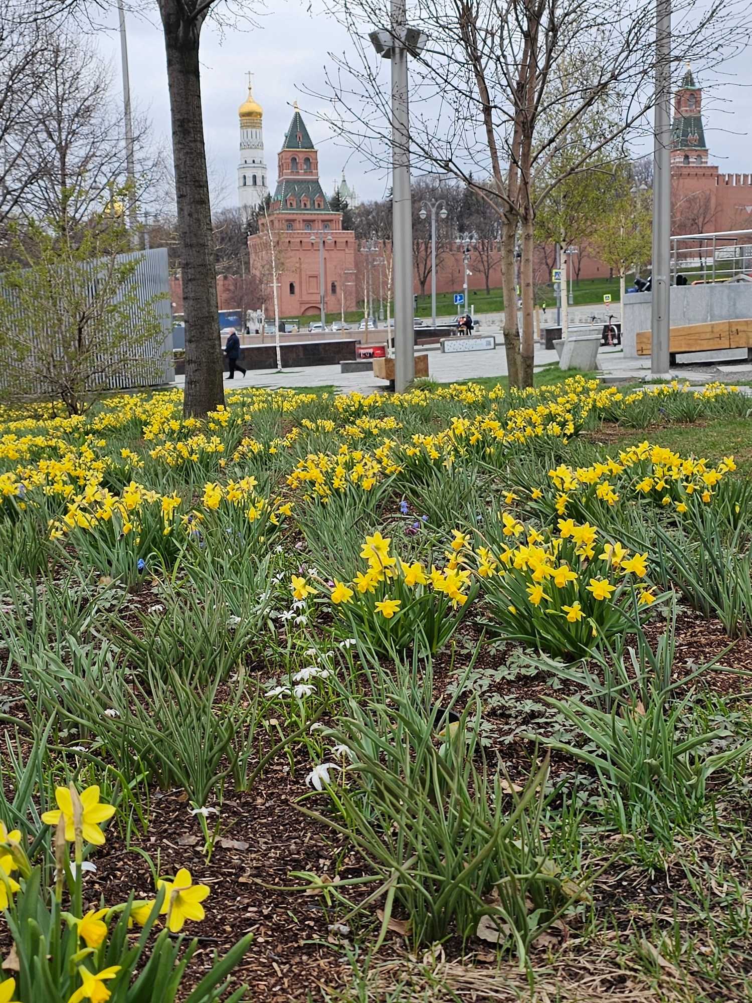 The image captures a landscape featuring rows of blooming yellow daffodils in a flower bed, situated alongside a pathway in what appears to be a public area. In the background, there are structures re…read more