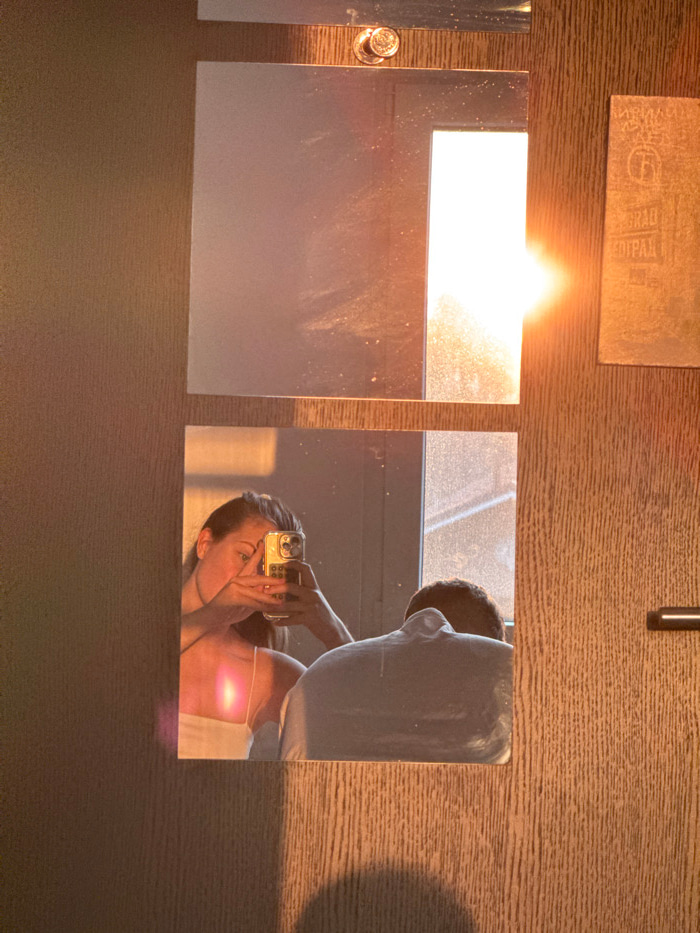 A woman and a man are reflected in a square mirror on a wood-paneled wall. The woman holds a smartphone up towards the mirror. A second mirror reflects sunlight. The man stands behind the woman, out o…read more