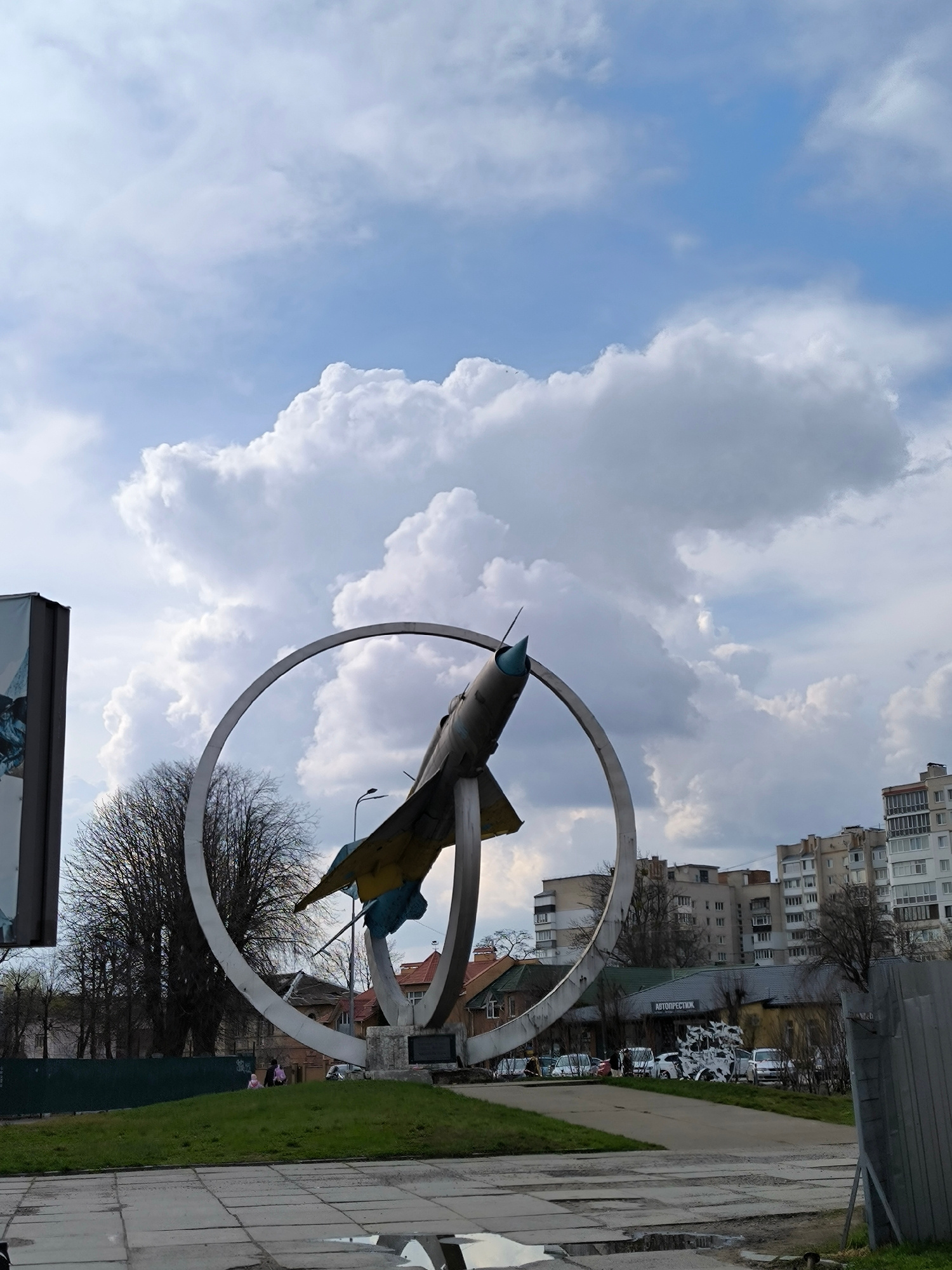 The image shows a Soviet MiG-21 jet fighter mounted as a monument on a pedestal within a circular metal ring. The jet is painted in a yellow and blue camouflage pattern, reflecting the colors of the U…read more