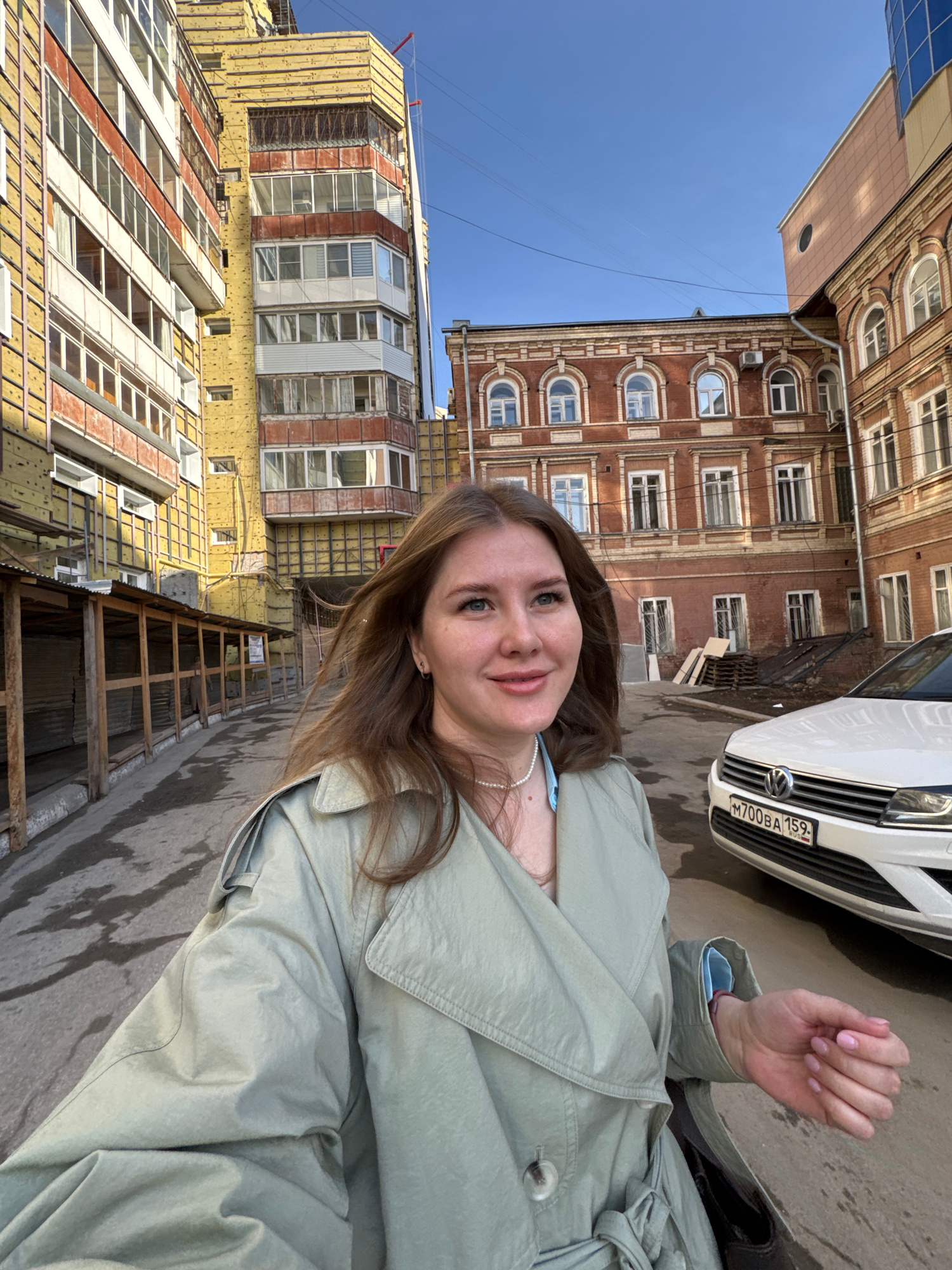The image shows a young woman in a light green trench coat, standing on a sidewalk in Perm, Russia. A white Volkswagen car is parked beside her on the right, its license plate showing "M700BA 159 RUS.…read more