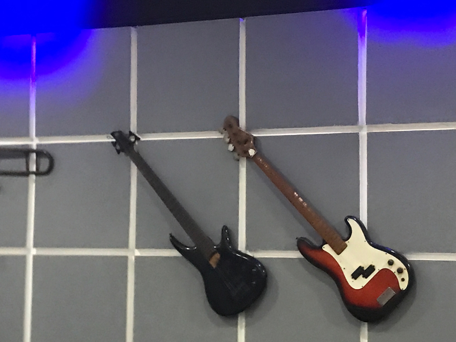 The image shows two miniature electric bass guitars mounted on a tiled wall. The tile grout lines are white, while the tiles themselves are gray. The guitar on the left is black, and the guitar on theβ¦read more