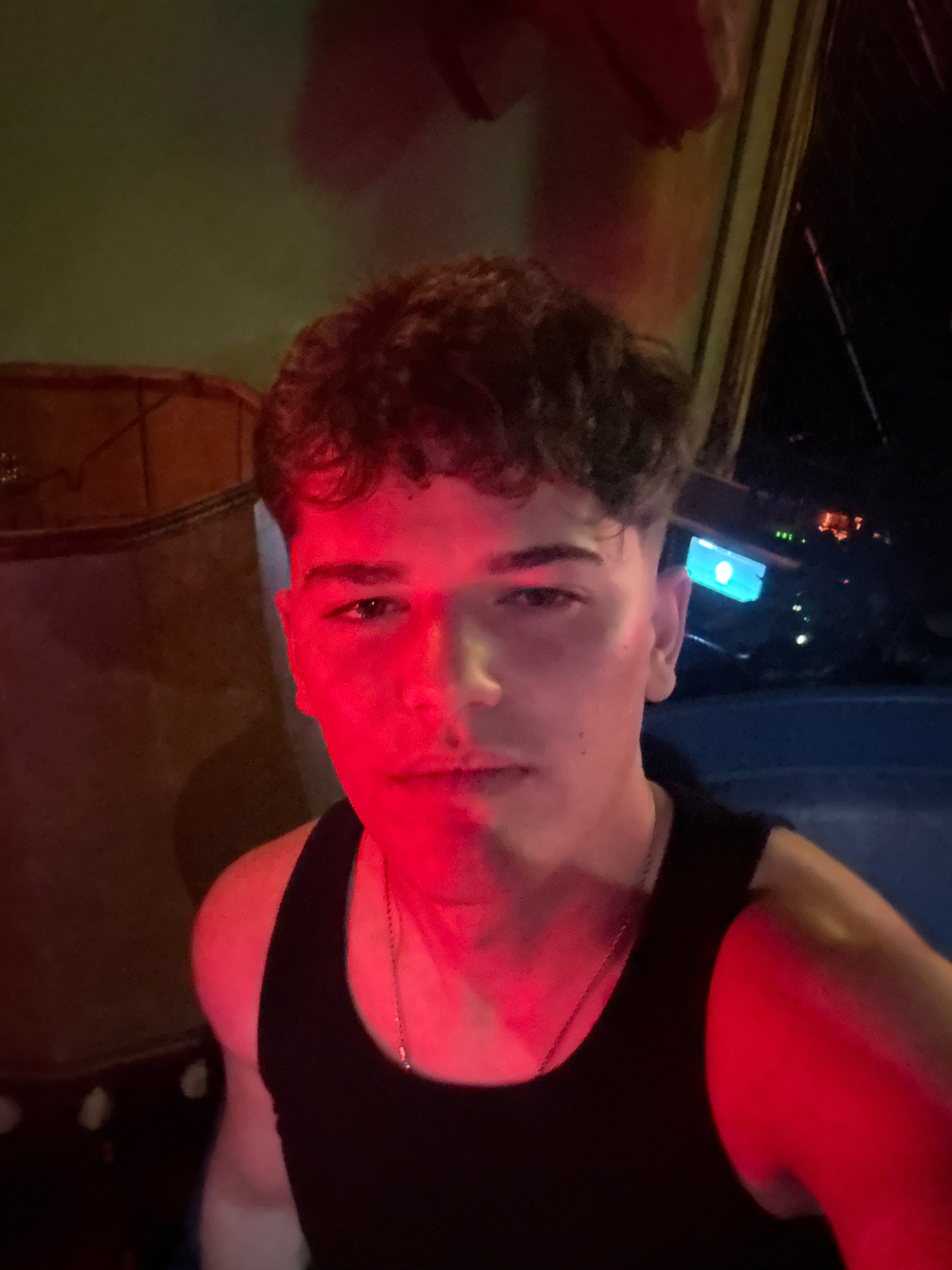 A young person, possibly male, with curly brown hair and wearing a black top, is captured in a dimly lit, indoor setting under dominant red artificial lighting. A thin silver chain necklace is visible…read more