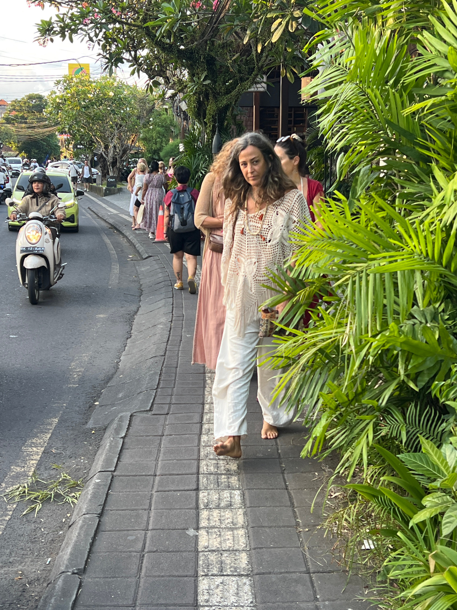 The image captures a vibrant street scene in the Ubud District of Indonesia. A woman with long, wavy hair stands barefoot on a tiled sidewalk, partially obscured by lush green foliage. She is wearing…read more