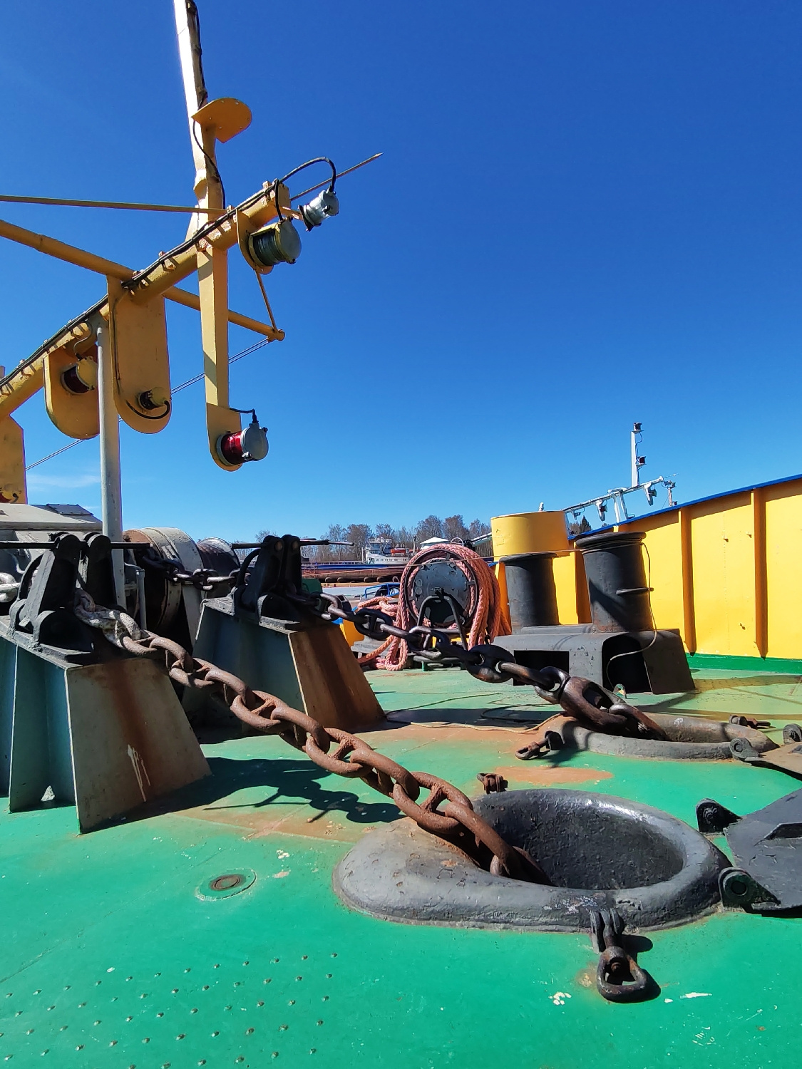 The image displays the deck of a working vessel, likely a ship or large tug, under a brilliant clear blue sky. In the foreground, heavy, rusted anchor chains are prominently featured, stretching acrosβ¦read more