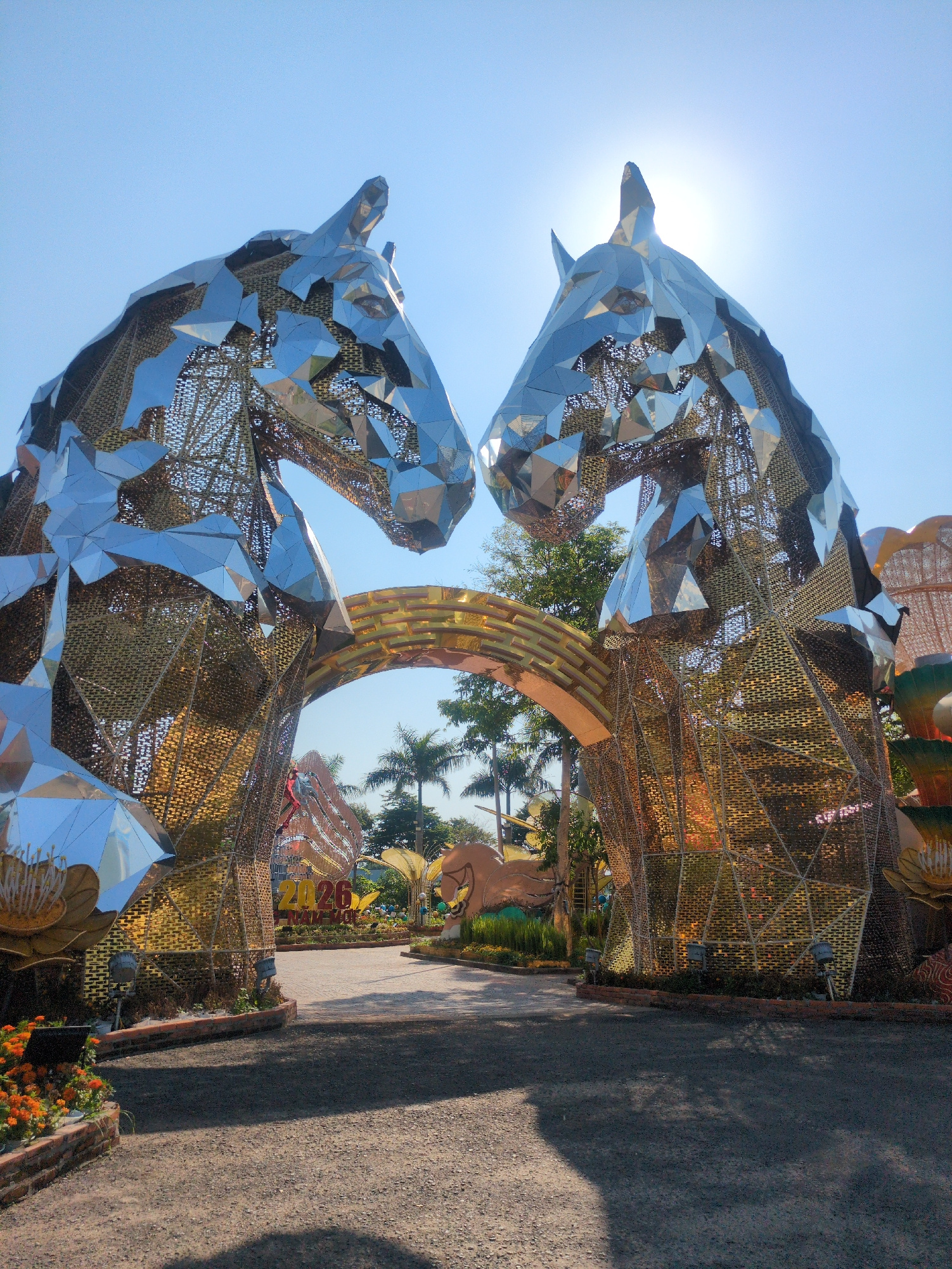 The image shows an outdoor art installation in Tuy Hòa, Vietnam. Two large, mirrored horse heads are prominent, constructed from geometric shapes and wire mesh. A circular archway is positioned betwee…read more