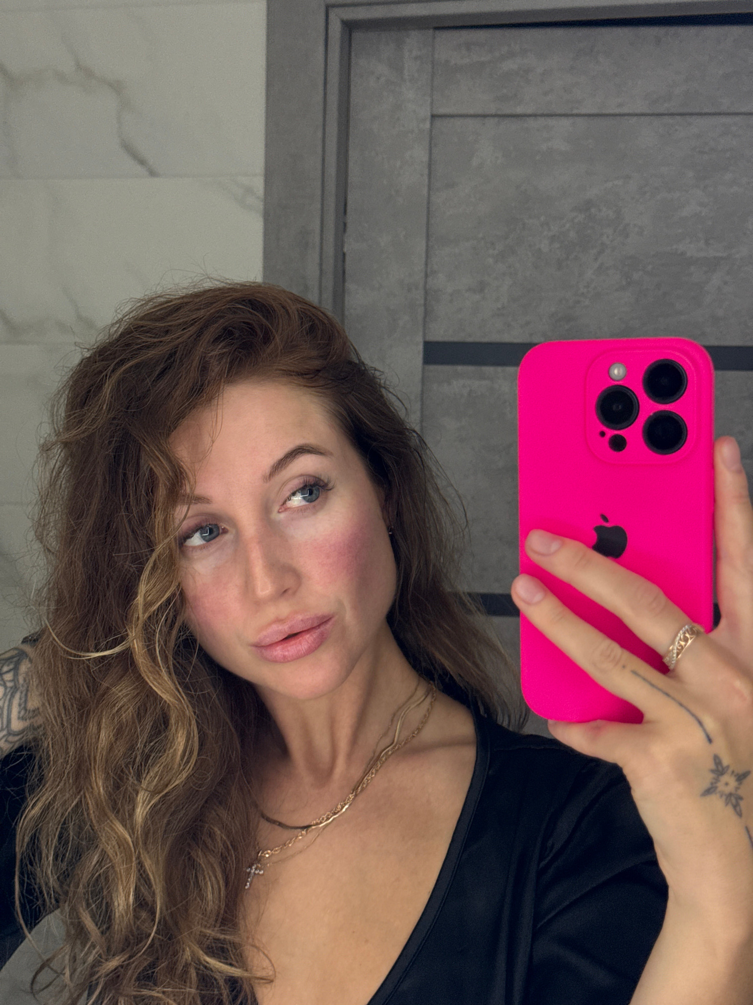 A woman with light brown, curly hair and blue eyes is taking a selfie. She is wearing a black top and a gold necklace with a cross pendant. She is holding a pink iPhone with a triple-lens camera in he…read more