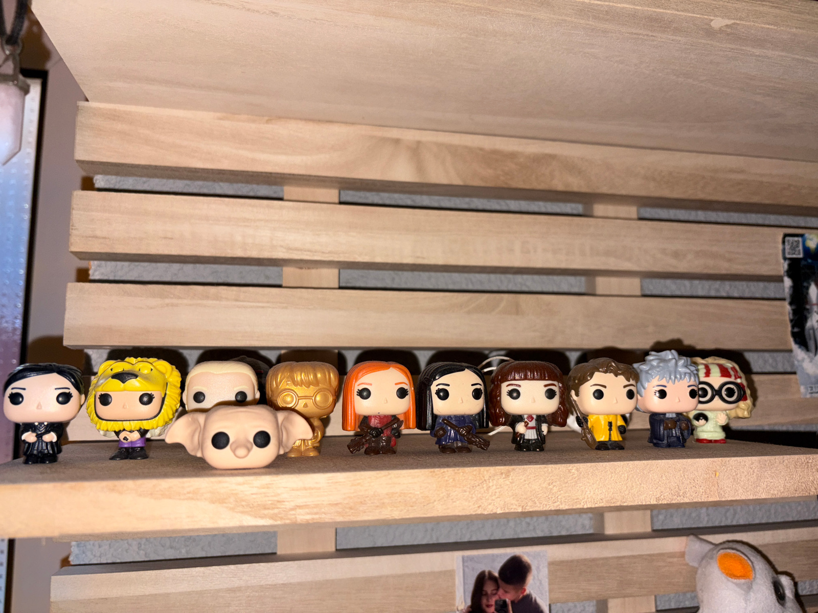 The image shows a collection of Funko Pop figurines displayed on a light-colored wooden shelf with horizontal slats. The figurines appear to be Harry Potter characters. From left to right, the figures…read more