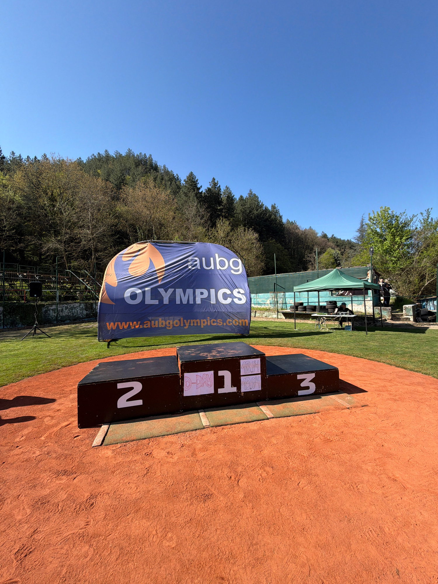 The image shows an outdoor scene, likely a sports event in Blagoevgrad, Bulgaria. A podium with "1", "2", and "3" marked on the front is present, positioned on a surface that appears to be a tennis co…read more