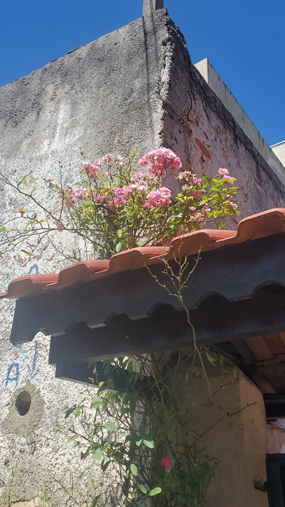 The image displays an exterior architectural detail in Curitiba, Brazil, under a clear blue sky. A dense cluster of blooming pink roses, exhibiting numerous open flowers and green foliage, is position…read more