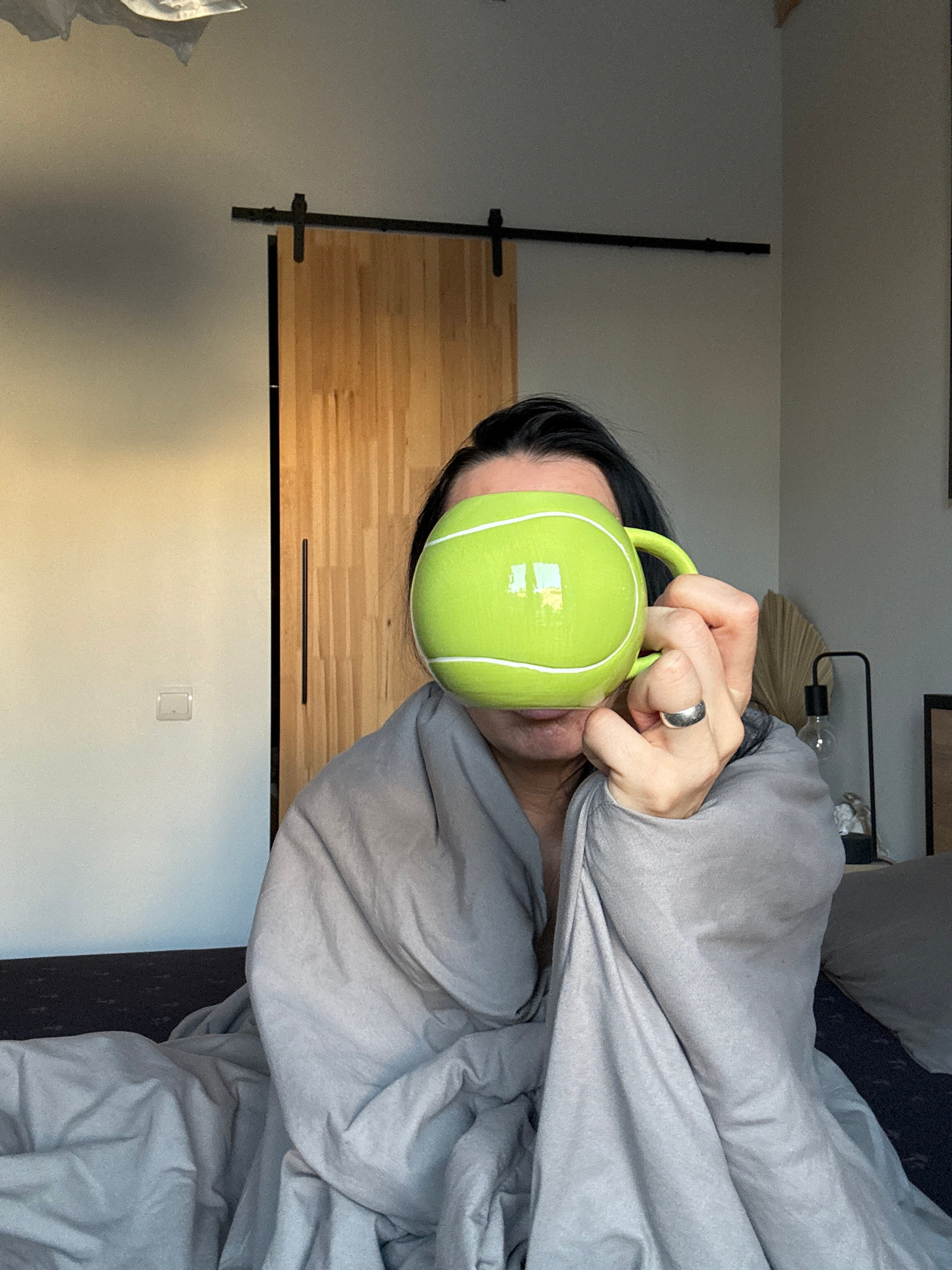 A person lies in bed under a gray comforter and holds a bright green tennis ball-shaped mug in front of their face. The person is wearing a ring on their right hand. The background shows a bedroom wit…read more