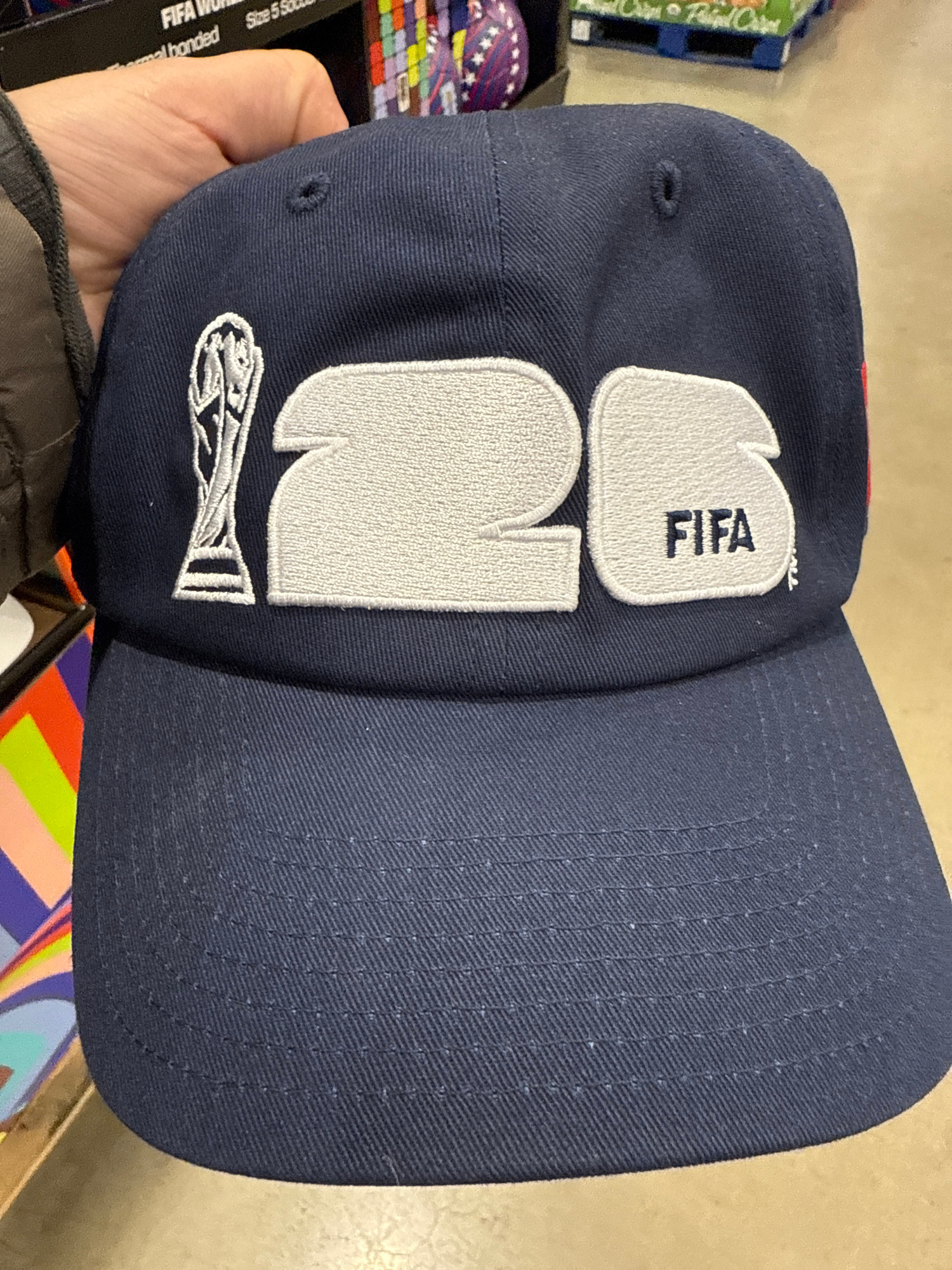 A person is holding a dark blue baseball cap with white embroidered designs in a retail environment. The embroidery includes "FIFA" stacked vertically above the number "26" and a stylized trophy at th…read more