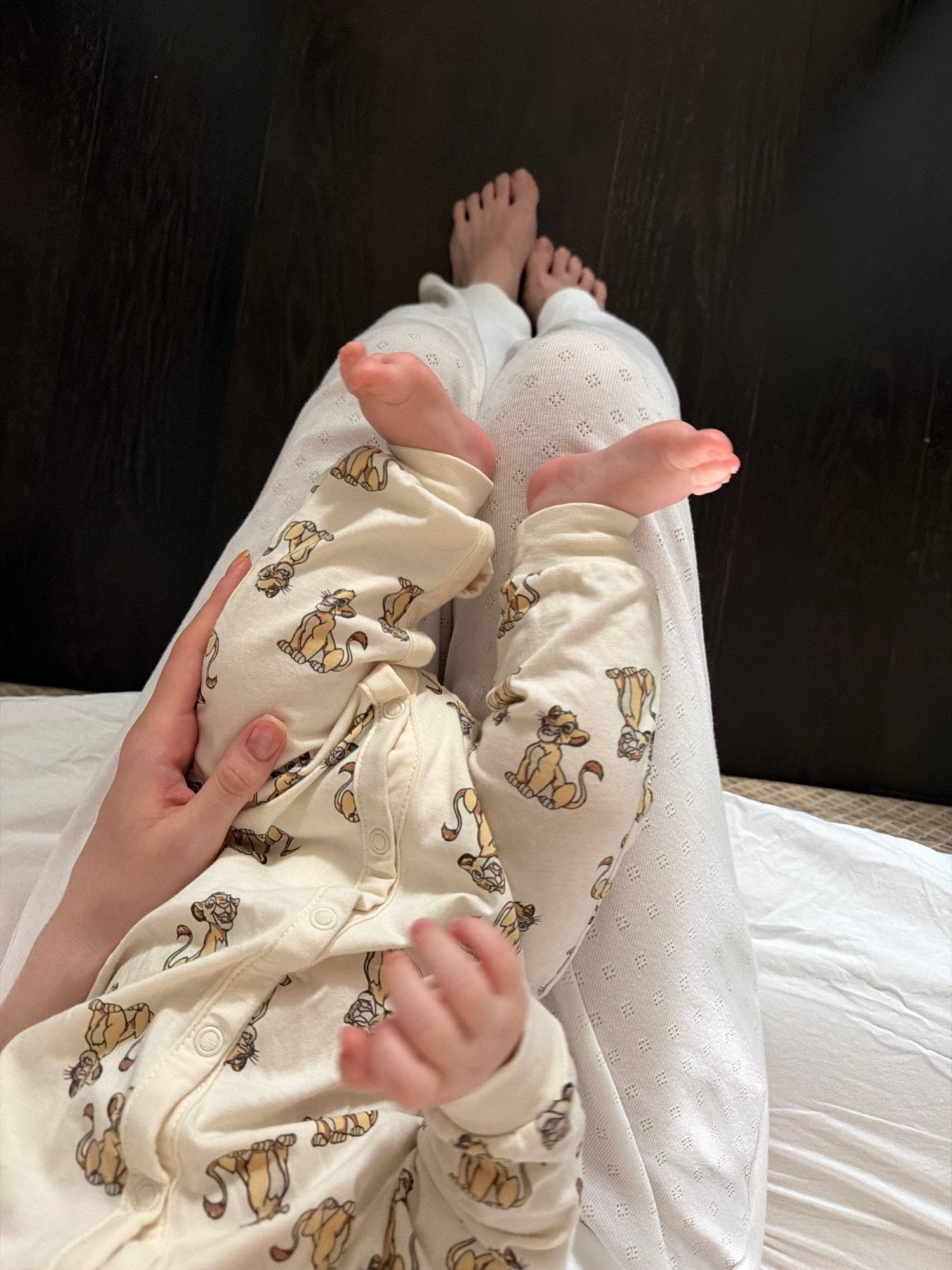 A photograph shows a person holding a baby wearing a light-colored, printed onesie. The person is wearing white pants and a textured top. The baby's bare feet are visible. The person's bare feet are a…read more