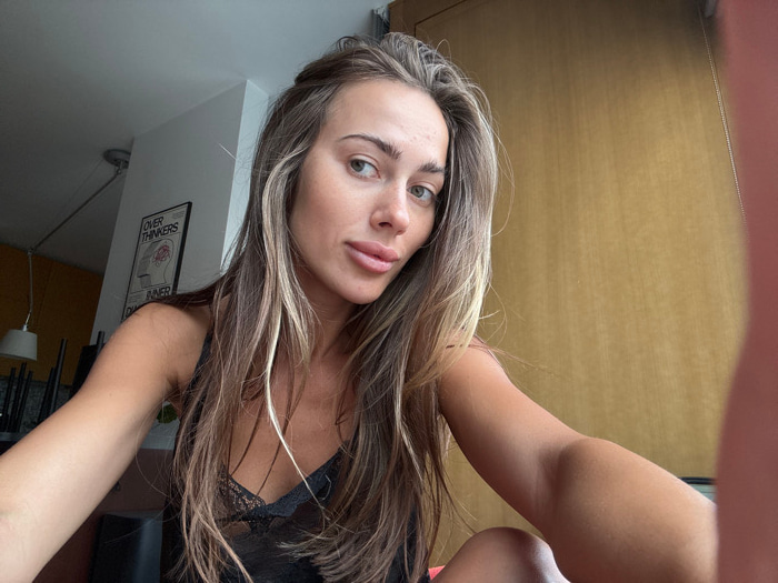 A close-up, indoor selfie photograph features an adult female subject. She has long, multi-toned hair, light-colored eyes, and full lips, and is wearing a black lace camisole. Her left arm is visible,…read more