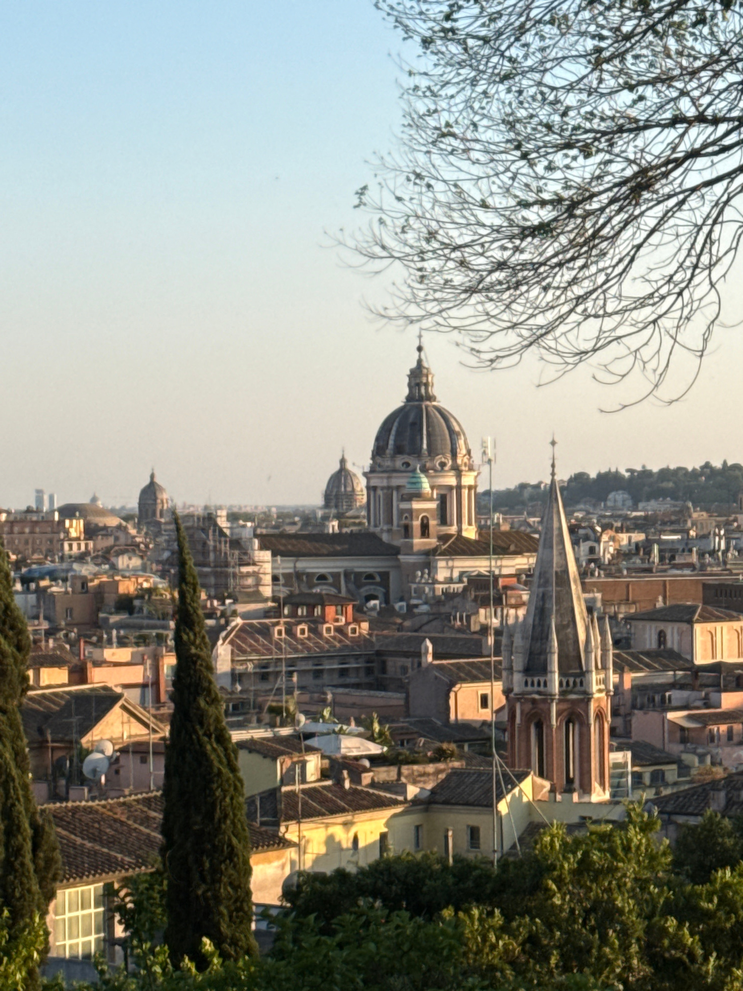 The image shows a cityscape of Rome, Italy, with a prominent church dome and spire visible among the rooftops. The scene is framed by bare branches on the left and lush green trees on the right. The b…read more