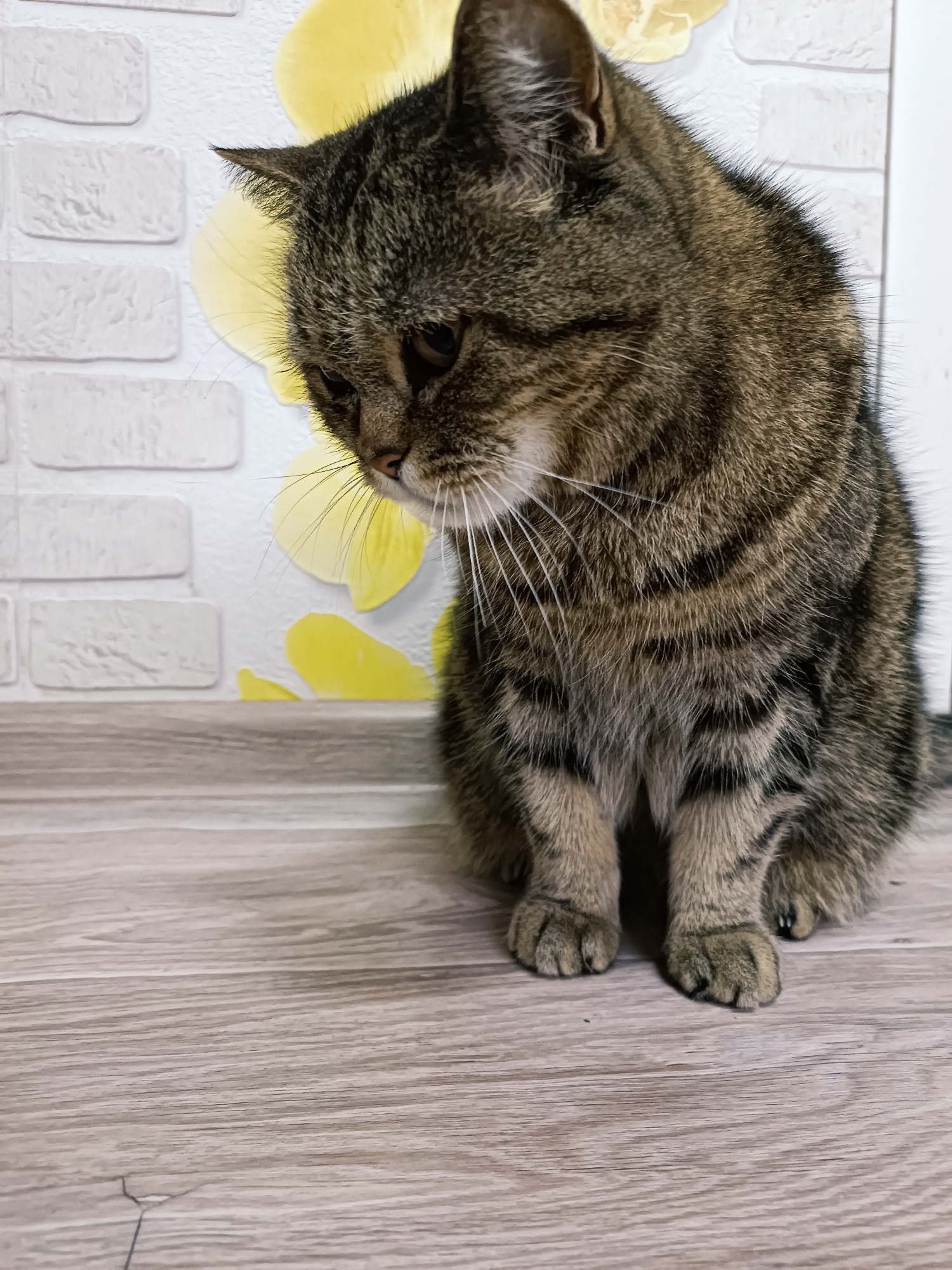 A brown tabby cat sits on a light brown, wood-patterned floor. The cat has its head lowered and appears to be looking down. Behind the cat is a wall with a white brick pattern overlaid with a yellow f…read more