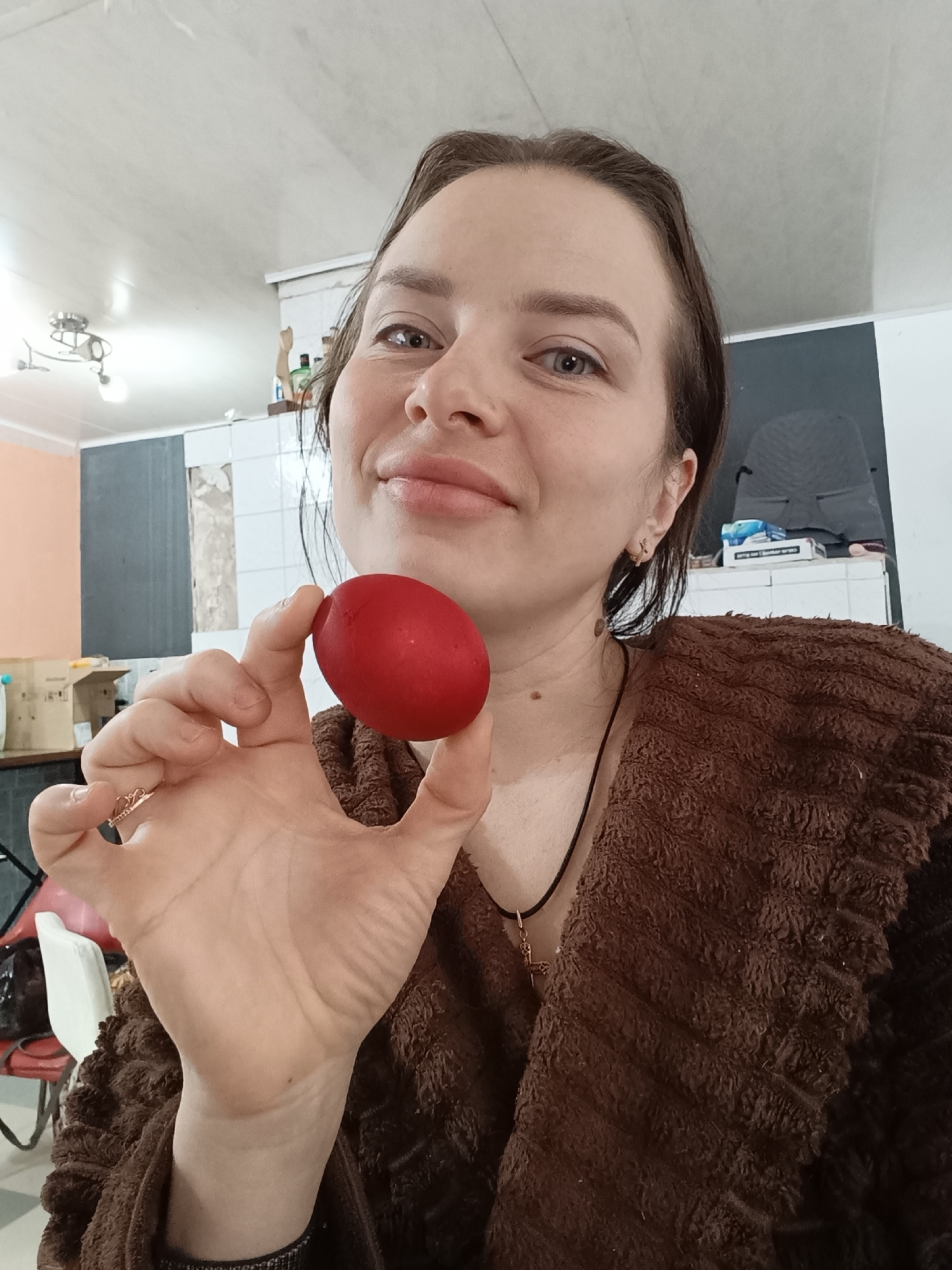 A woman with brown hair is holding a red egg in her right hand. She is wearing a brown, fluffy robe and a necklace with a cross pendant. The background shows a room with a white ceiling, a light fixtu…read more