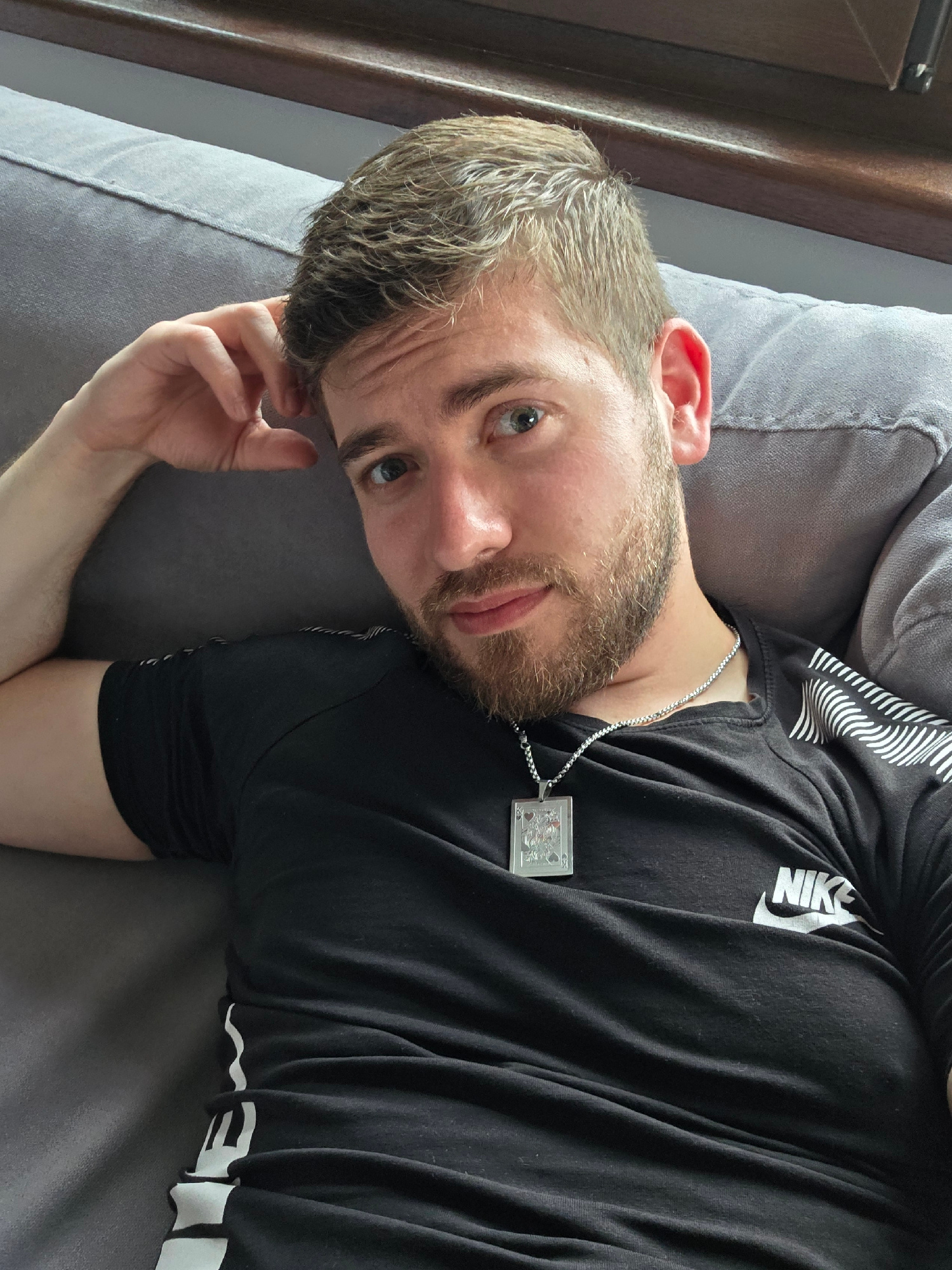 A man is lying on a grey cushion or sofa. He is wearing a black t-shirt with a white Nike logo. He has a silver chain with a playing card pendant around his neck. The background is blurred, but a dark…read more