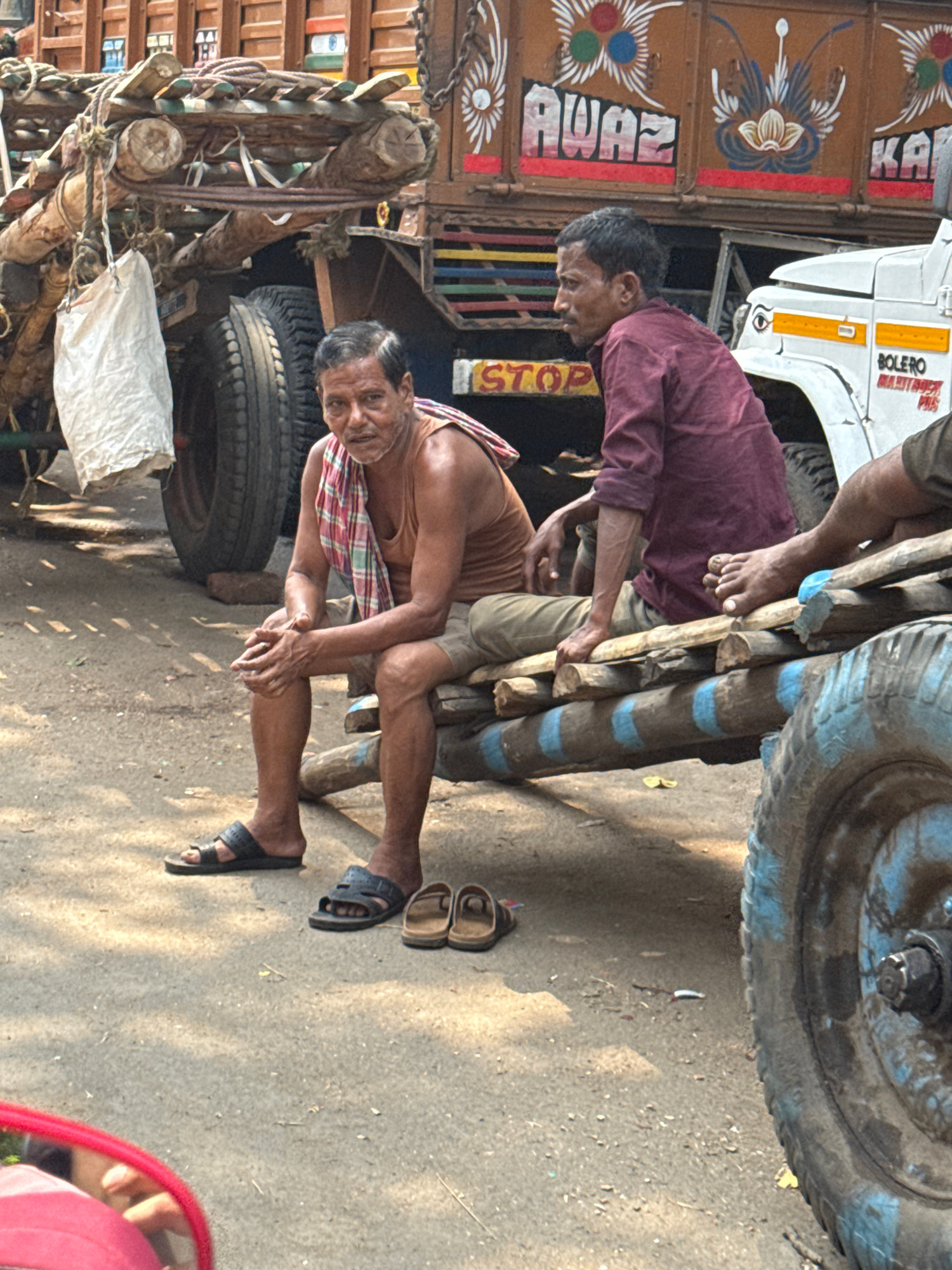 Two men stand beside a loaded truck in Kolkata, India. The truck's cargo and frame are constructed of wood, secured with chains. Tires are stacked behind the seated man, while another large tire is vi…read more