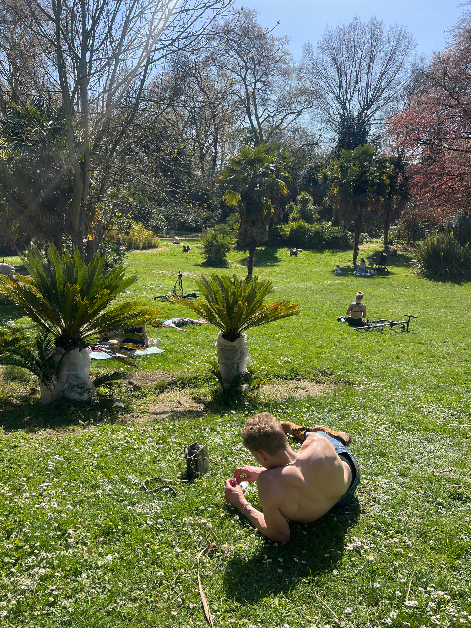 The image depicts a sunny day in a park in London, United Kingdom. The ground is covered in green grass with small white flowers. A shirtless, fair-skinned individual is kneeling on the ground, appear…read more