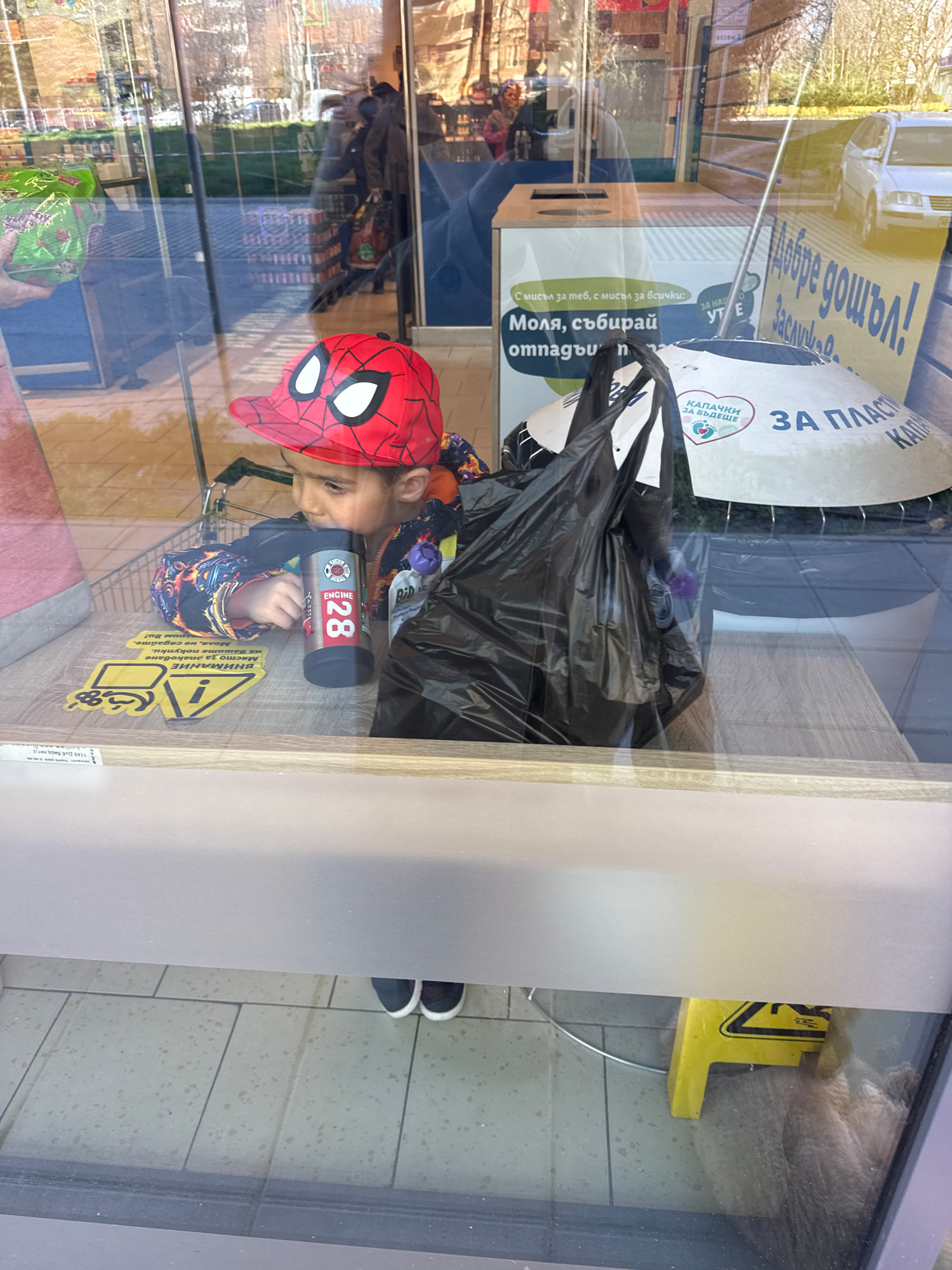 A child wearing a Spider-Man baseball cap is seen through a glass window. The child is holding a toy fire engine. The window reflects the outside environment, including trees and buildings. Inside, be…read more