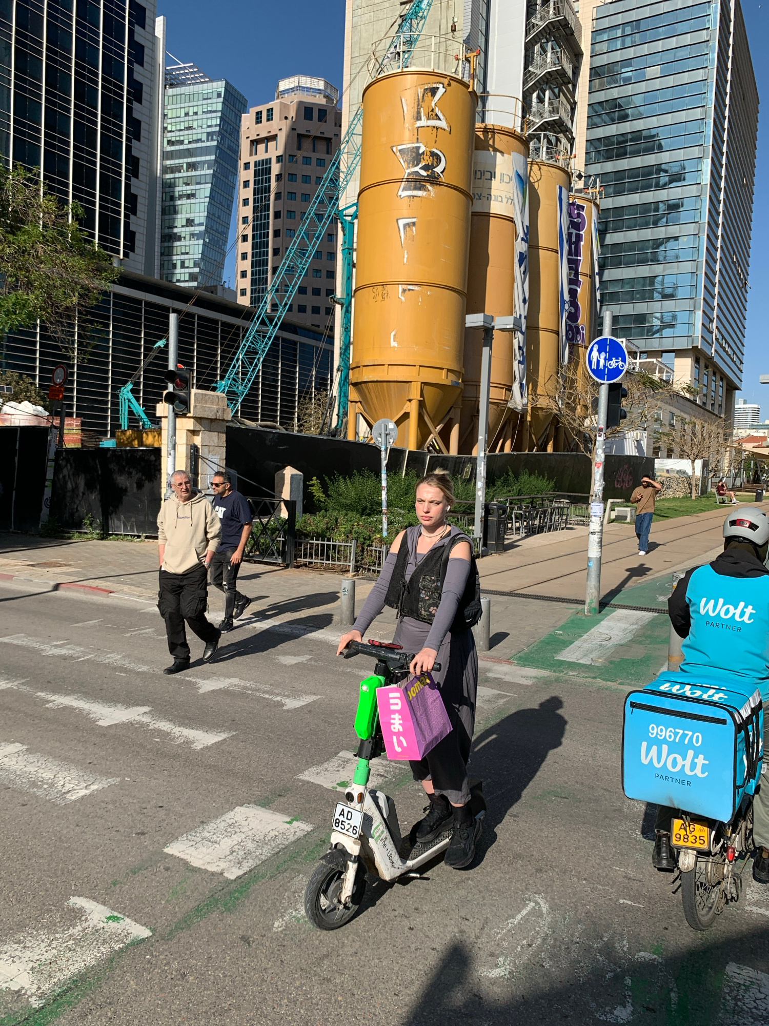 The image captures a street scene in Tel Aviv, Israel, featuring a woman on an electric scooter holding a pink bag with Japanese writing, adjacent to a Wolt delivery driver on a motorcycle. The backgr…read more