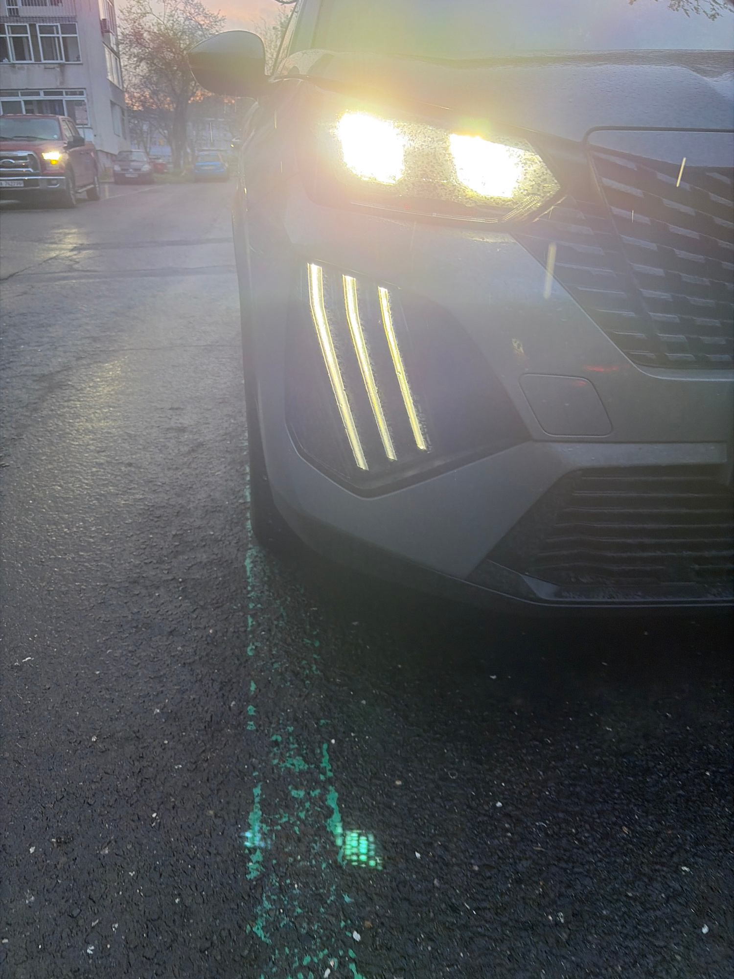 The image shows the front of a gray car with its headlights and daytime running lights illuminated. The car is parked on a dark asphalt surface. There appears to be a green painted parking line next t…read more