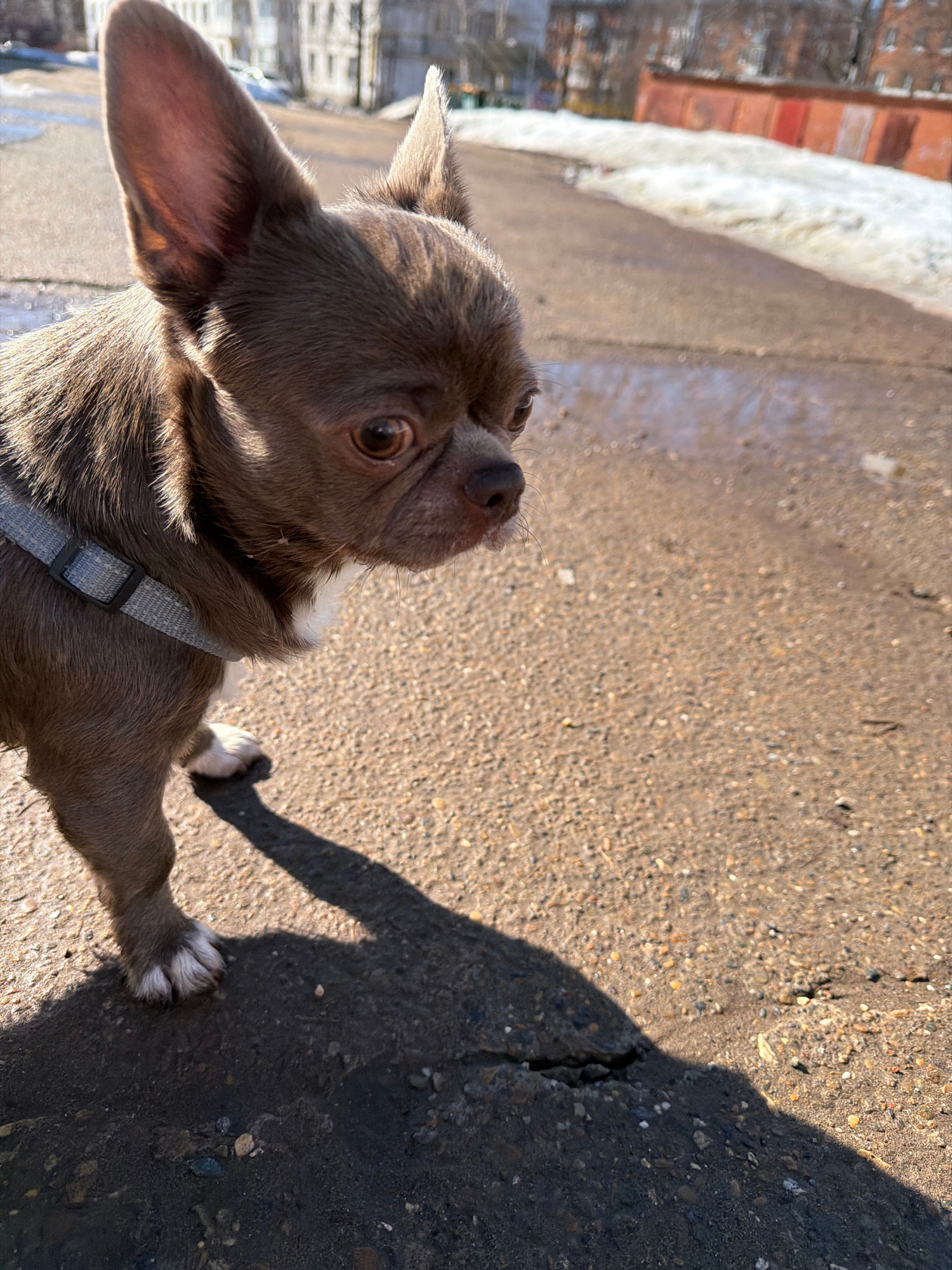 The image shows a small, brown Chihuahua-like dog with white paws and a grey harness standing on a concrete surface. The dog is looking upwards and to the left of the frame. A shadow of a person or ob…read more