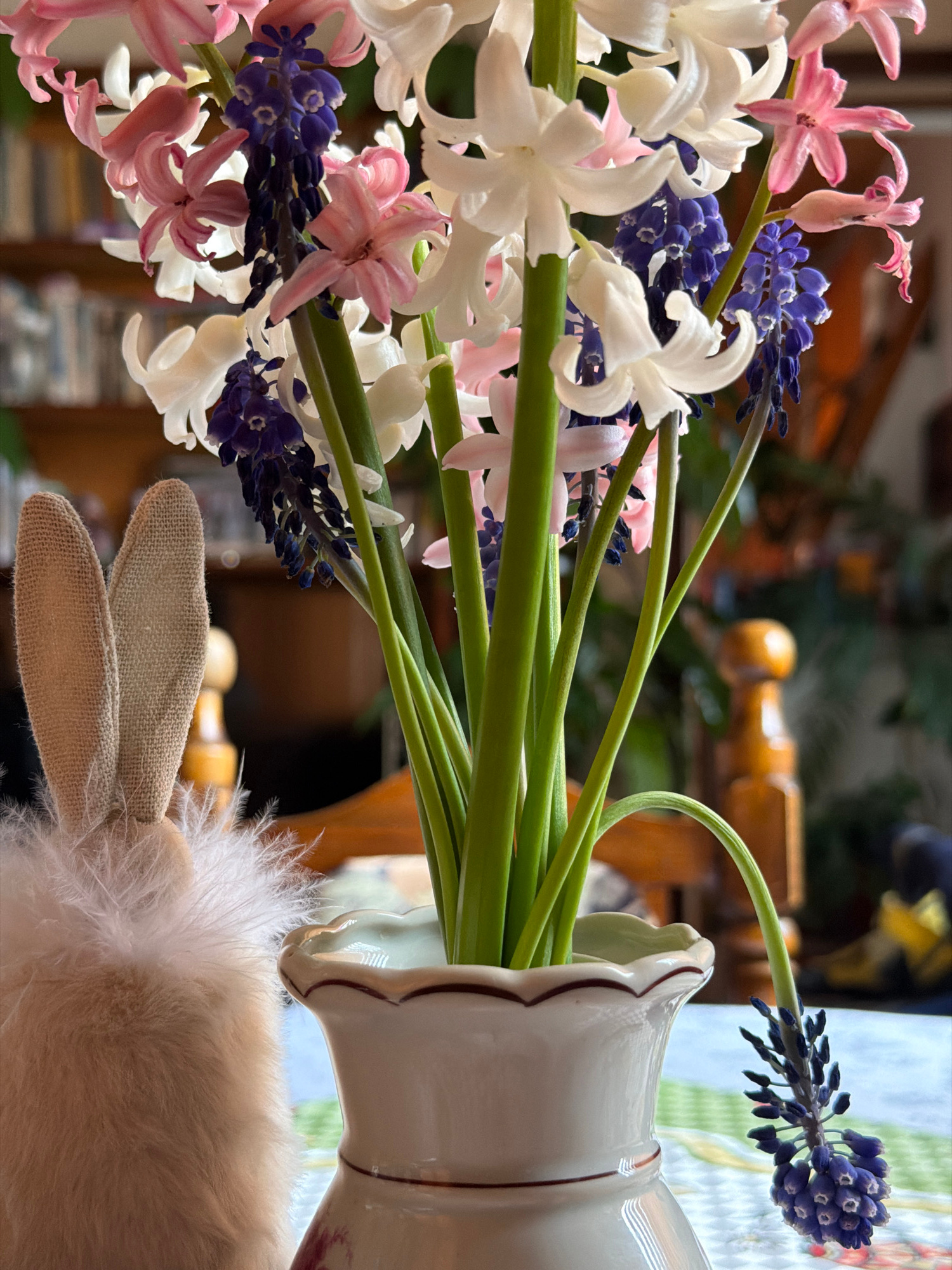 The image depicts a floral arrangement in a white vase with brown trim, featuring pink and white hyacinths alongside blue grape hyacinths. The vase is positioned near a stuffed rabbit toy, with its ea…read more
