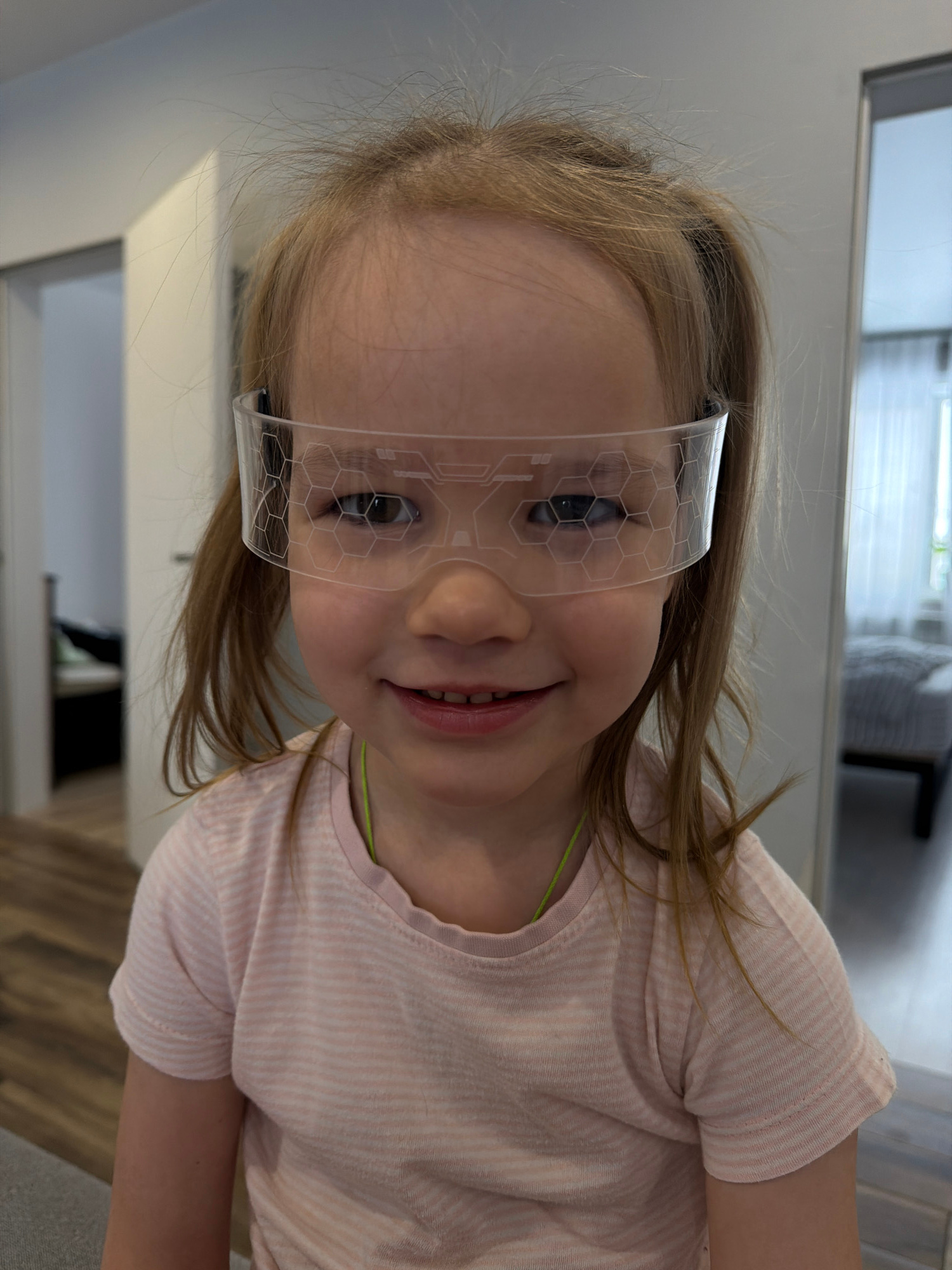 A young girl with light skin and blonde hair smiles while wearing clear, decorative glasses with a honeycomb pattern. She is wearing a light pink and white striped short-sleeved shirt with a neon gree…read more