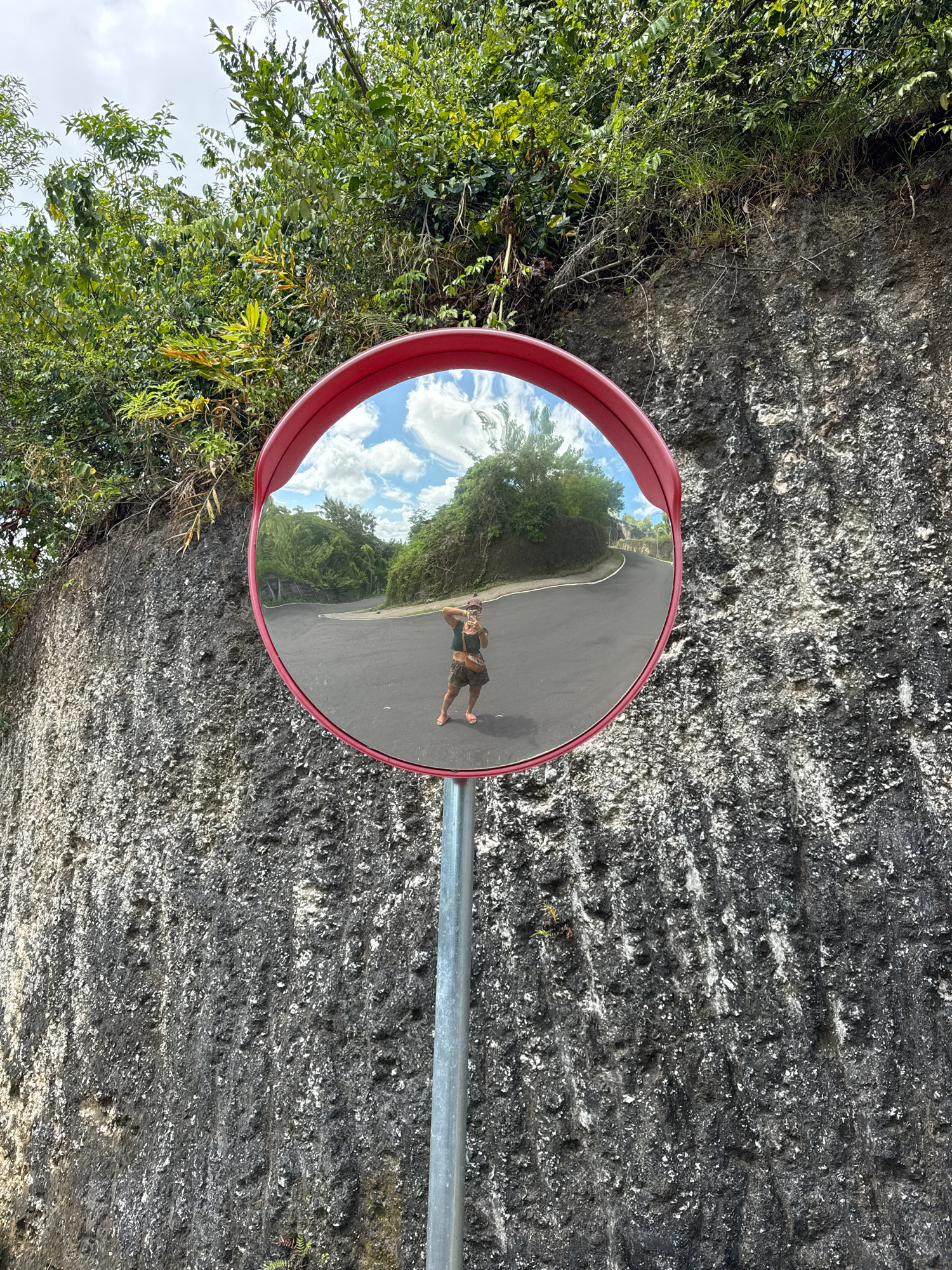 The image shows a convex road mirror mounted on a pole beside a road in Ungasan, Indonesia. The mirror's red frame is visible. The mirror reflects the road, trees, and a cloudy sky. A person is visiblβ¦read more