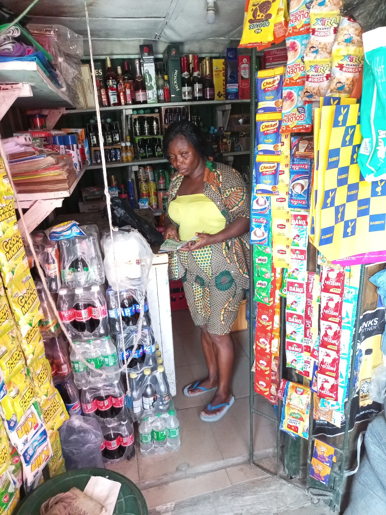 The image shows a woman standing inside a small store in what is likely Satellite Town, Nigeria. The store is packed with various goods: alcoholic beverages, powdered drinks (like Milo and Dano), tea…read more