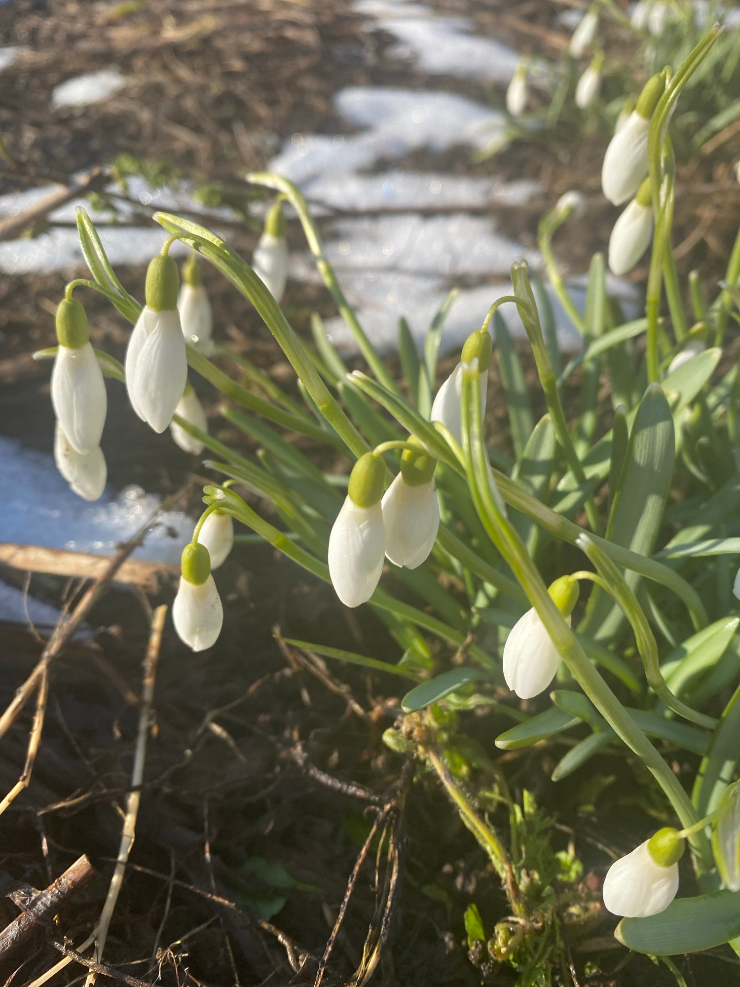 The image shows a close-up view of snowdrop flowers (Galanthus nivalis) growing in a garden bed. Some snow remains on the ground, indicating early spring. The background shows dark soil, twigs, and de…read more