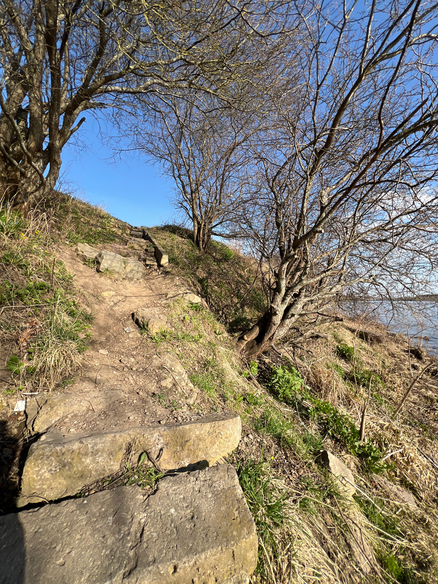 The image shows a view upwards towards a steep grassy bank with a tree. The tree is mostly bare of leaves, with many branches reaching across a blue sky. The bank is covered with grass, dry vegetation…read more