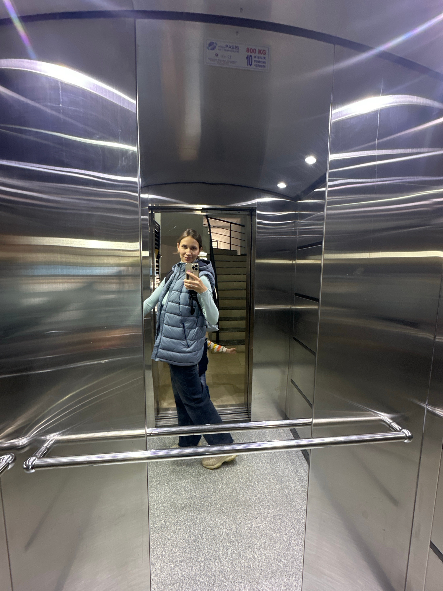 A person stands in a stainless steel elevator and takes a selfie in Fethiye, Turkey. The elevator has a handrail, a speckled gray floor, and a sign with the text "800 KG" visible in the top left corner. The reflection in the stainless steel walls distorts the surrounding environment, revealing a doorway with stairs. The person is wearing a light blue puffy vest, long-sleeved shirt, dark denim jeans, and off-white sneakers with colorful socks. | Open Wire