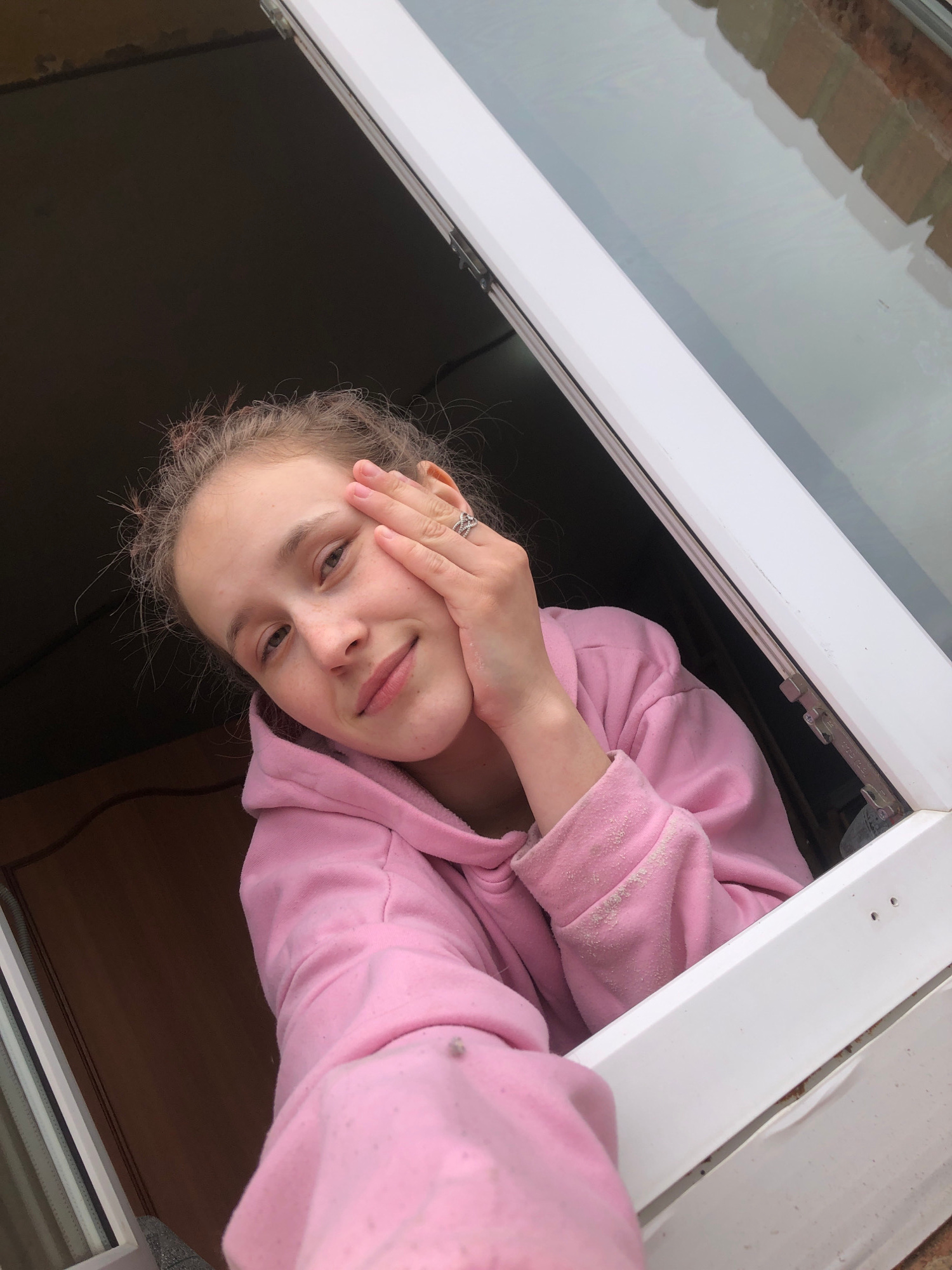 A woman wearing a pink hoodie peers into the camera from a window. She has fair skin, blonde hair, and is touching her forehead with her left hand. A silver ring is visible on her left ring finger. Th…read more