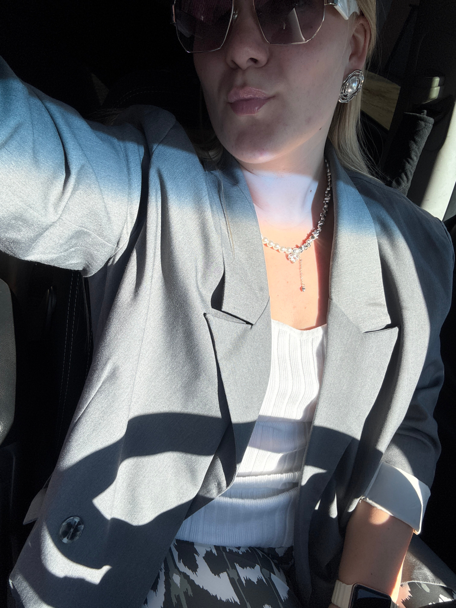 A person wearing sunglasses and a gray blazer sits in a car. They are wearing a silver necklace and earrings. The interior of the car is black. The location is unknown and not specified in the prompt.