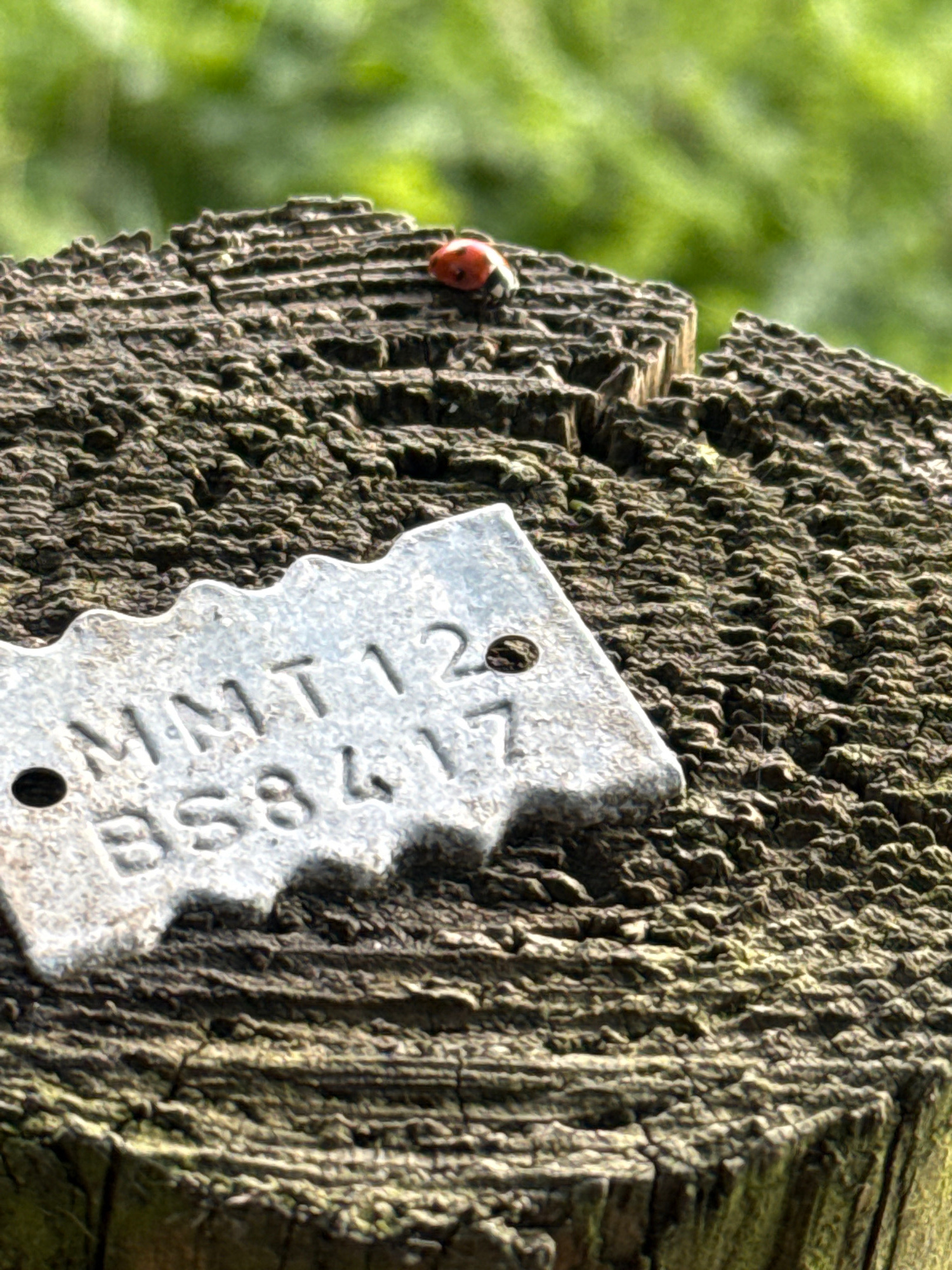 The image shows a weathered wooden post with a metallic tag attached. The tag is partially obscured by the post's texture and has lettering that appears to read "MNT12 35817". A red ladybug with blackβ¦read more