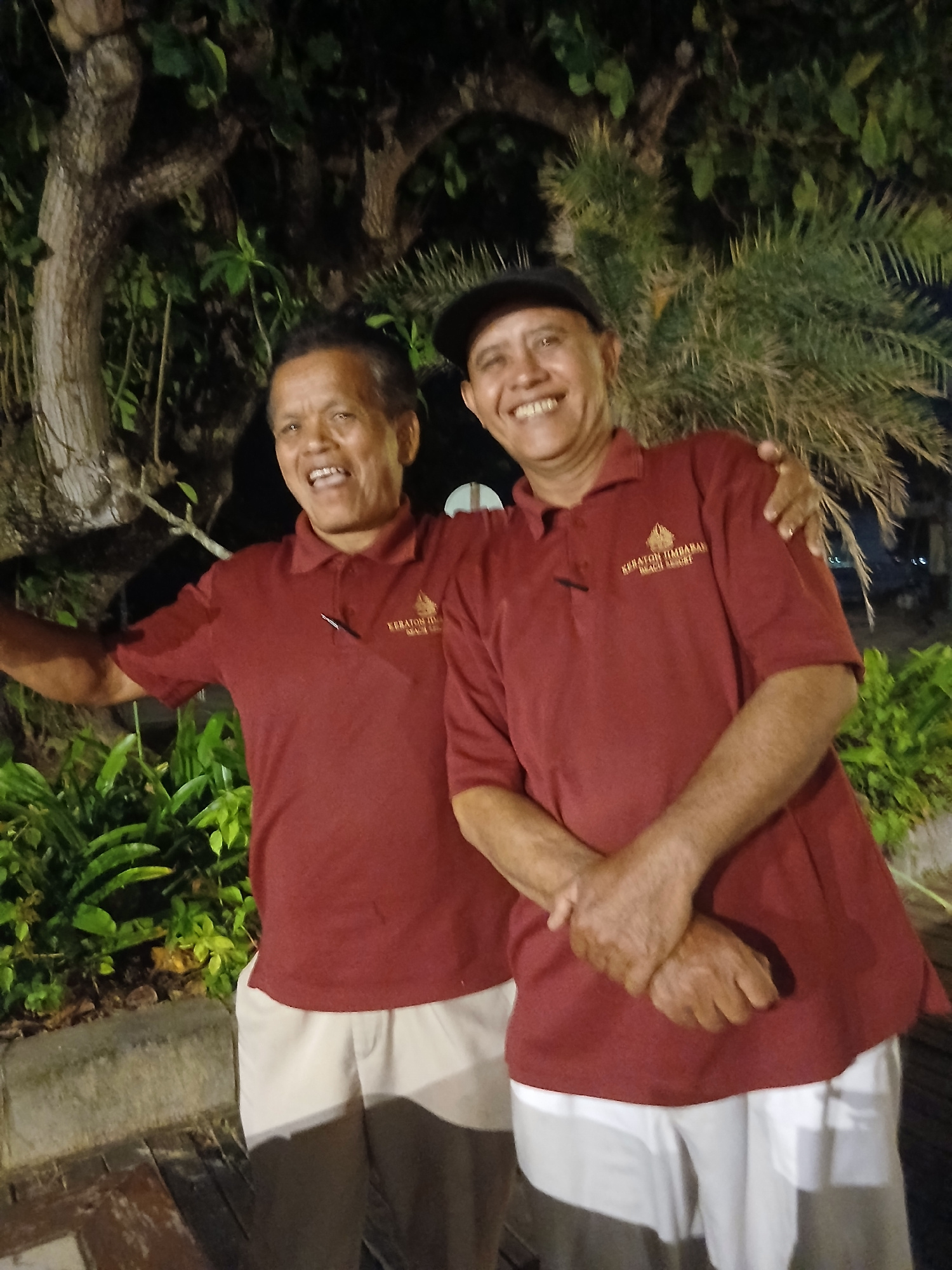 Two men wearing red polo shirts and white pants are embracing each other outside in a garden-like setting. The shirts appear to have a logo on them. The men are smiling and seem to be enjoying the mom…read more